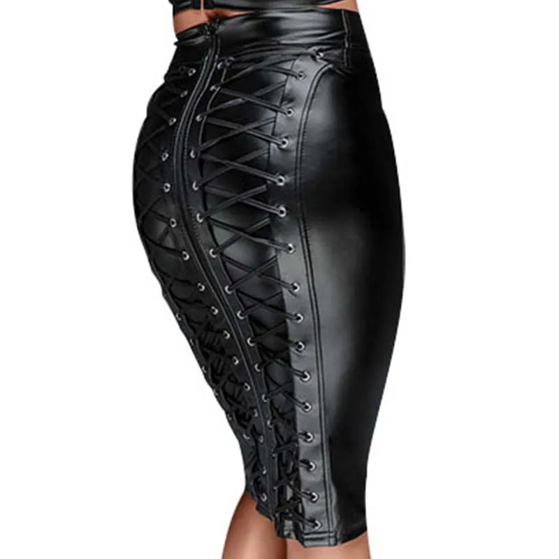 Юбка-карандаш из искусственной кожи, черная, с молнией сзади, с запахом, в готическом стиле, облегающая юбка миди