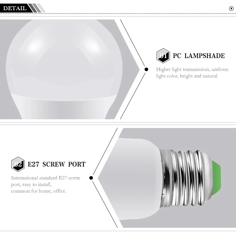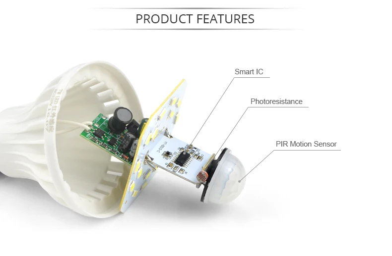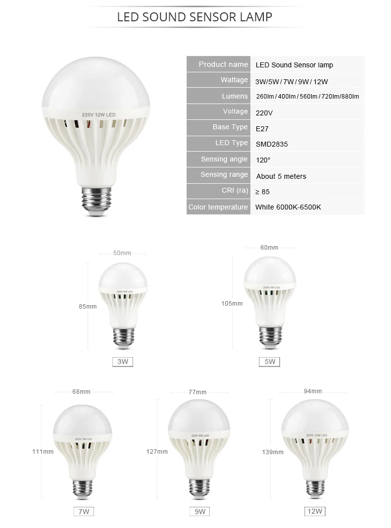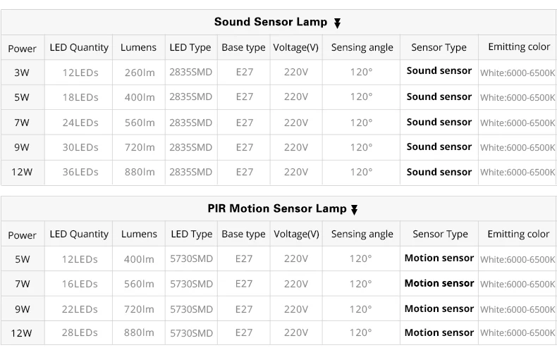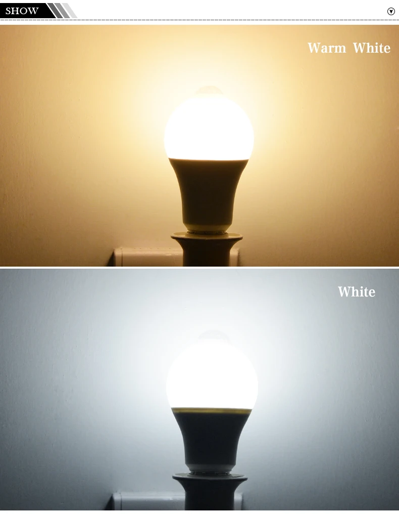 Цвет освещения: белый/теплый белыйЦветовая температура: белый: 6000k-6500k; Теплый белый: 2800k-3500kТип разъема: E27Дальность обнаружения: ≤ 5 мУгол обнаружения: около 120 °Мощность: 3W5W/7W/9W/12W/18WНапряжение: AC200V-240V