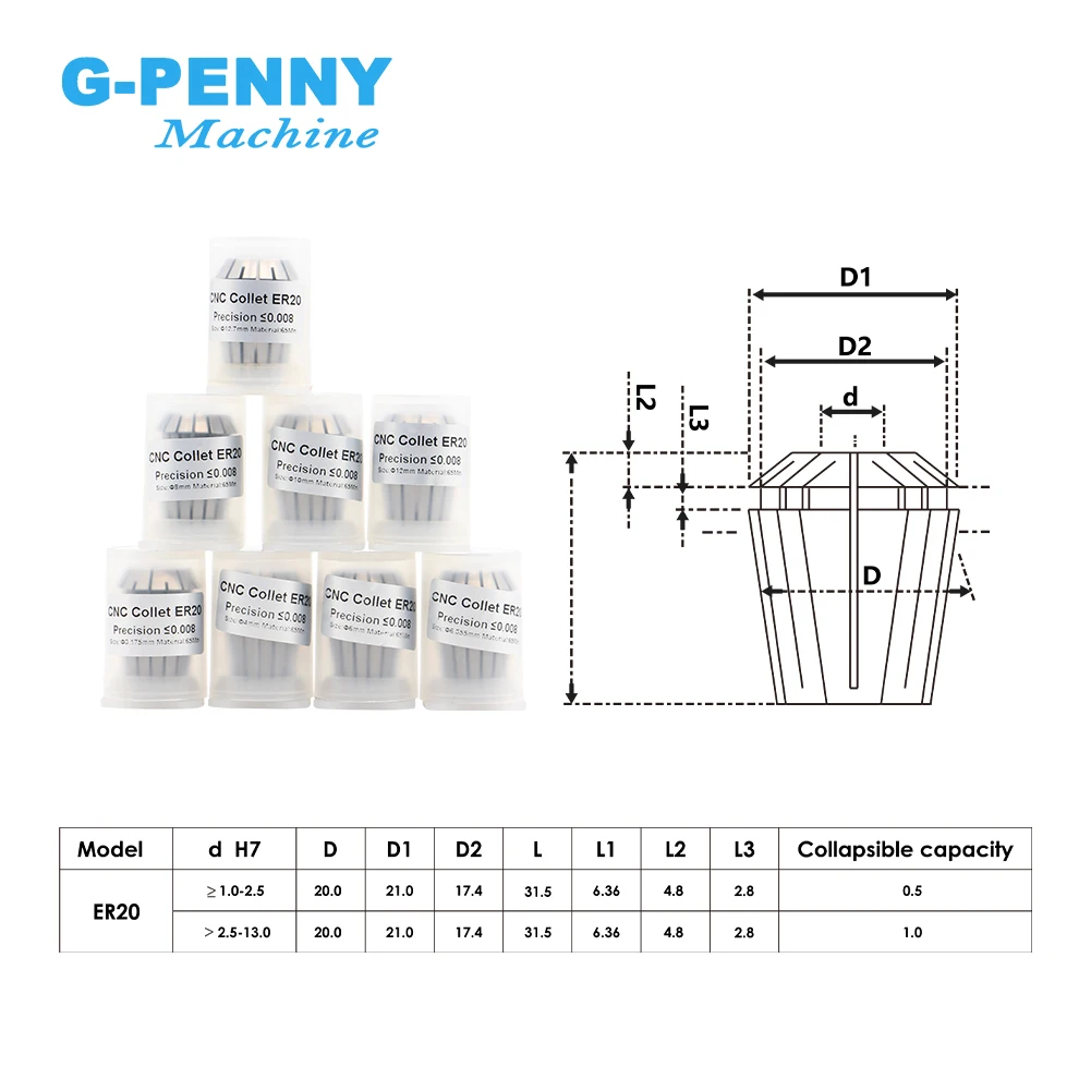 1 комплект ER20 Высокая точность Цанга (≤0,008 мм) --- подача заявки на 4,6,8,10,12,1/2,1/4,1/8 (в качестве подарка)