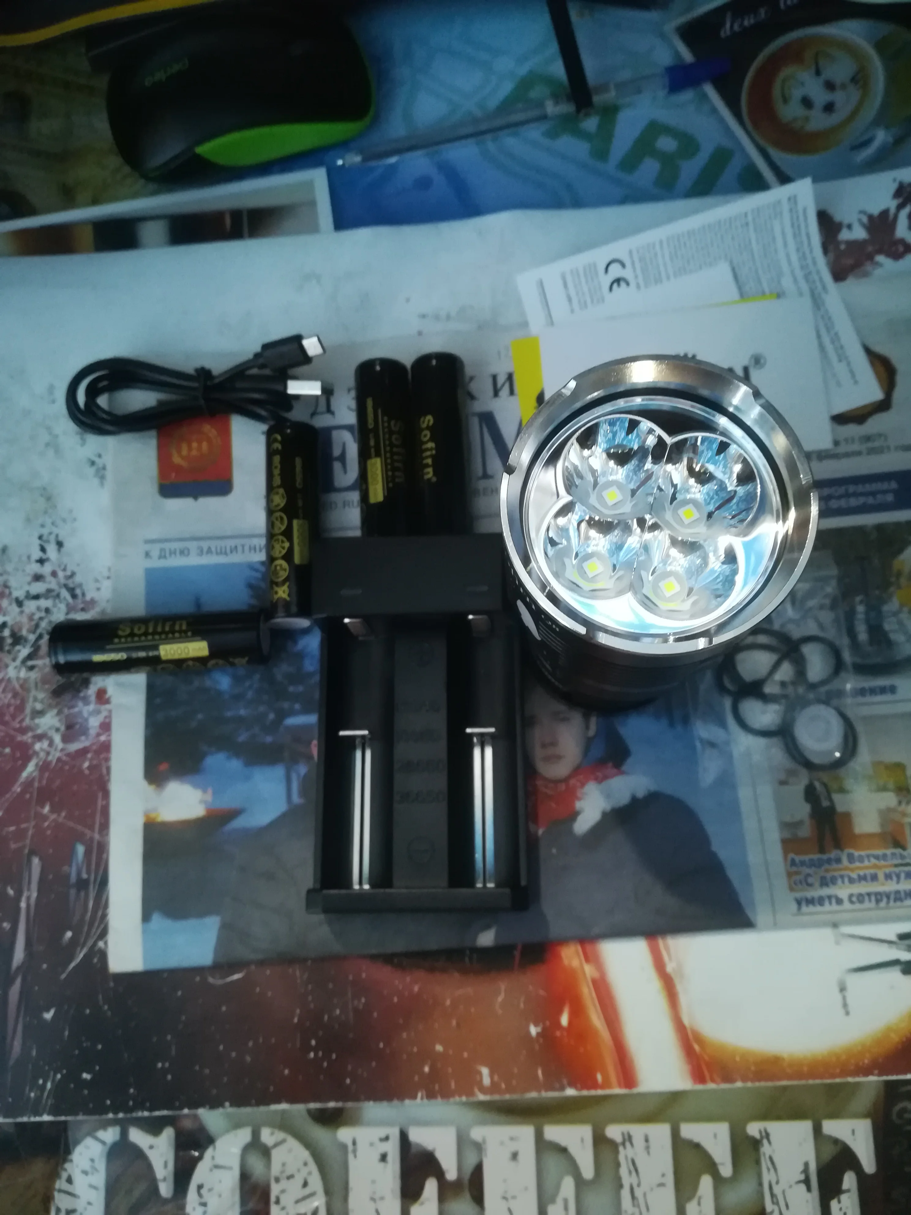 Фонарь пришёл очень быстро примерно неделя. Светит супер раз в 5 лучше автомобиля, не ожидал что такой маленький размер. Тяжёлый в зимней куртке без проблем можно носить, в летней неполучится. Зарядку думаю ещё 1 надо чтобы сразу 4 аккума заряжать