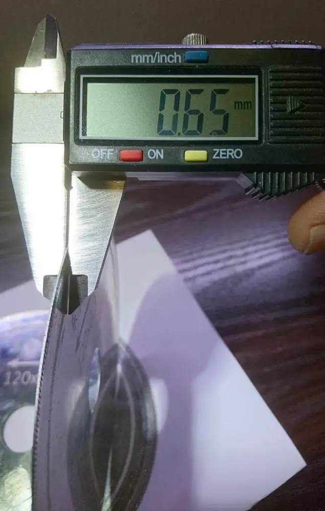 Толщина не соответствует указанному на диске размеру 0.3. Фактически толщина металла - 0.44 мм, а в месте алмазного напыления 0.65-0.68 мм. Вместо ожидаемого пропила примерно в 0.5 мм получается паз в 1.5 мм.