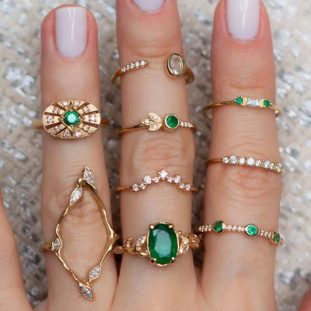 Комплект колец в стиле бохо Женский, комплект колец с камнями зеленого и синего цветов, резные ювелирные украшения с геометрическим дизайном, с золотыми волнами и кристаллами, Модная бижутерия