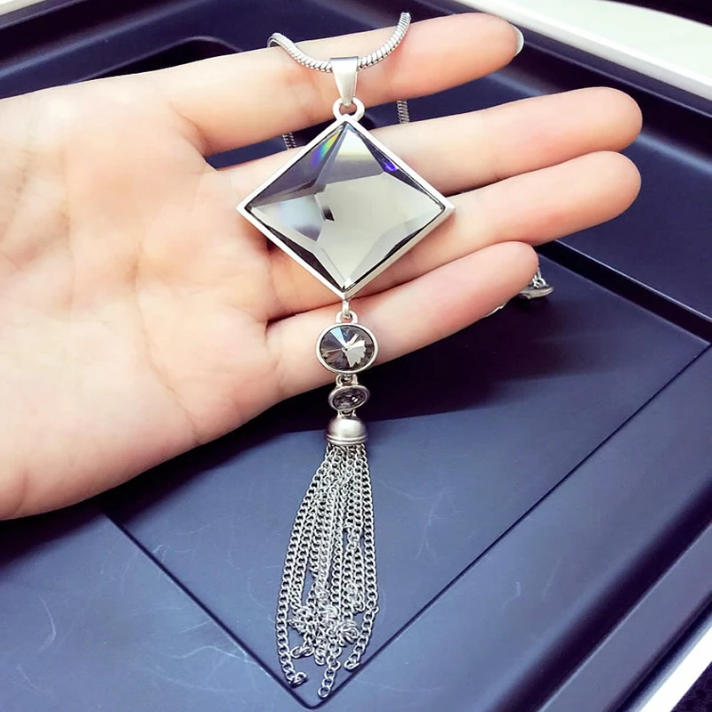 LWMMD серебряный цвет длинное ожерелье со стразами Vintag квадратный кристалл стекло кулон ожерелья для женщин ювелирные изделия Кисточкой Ожерелье