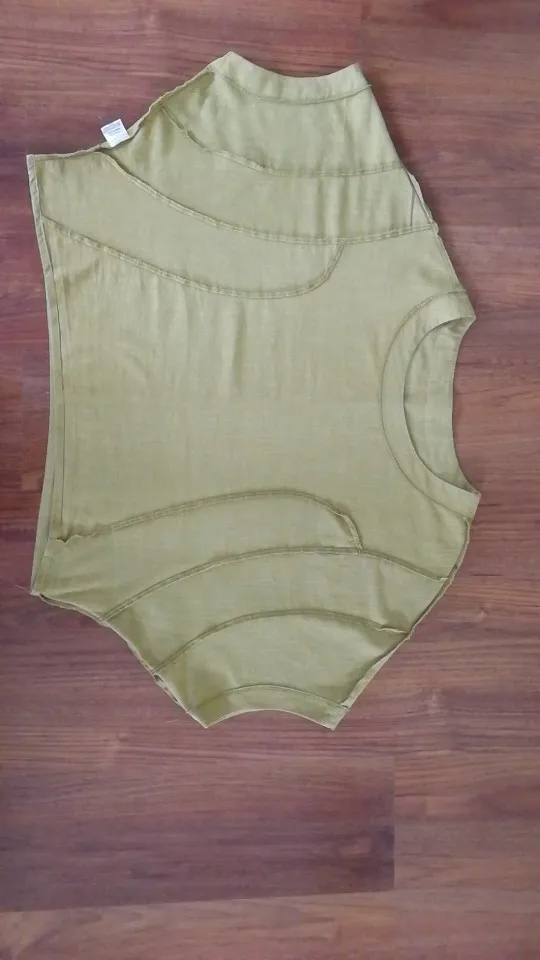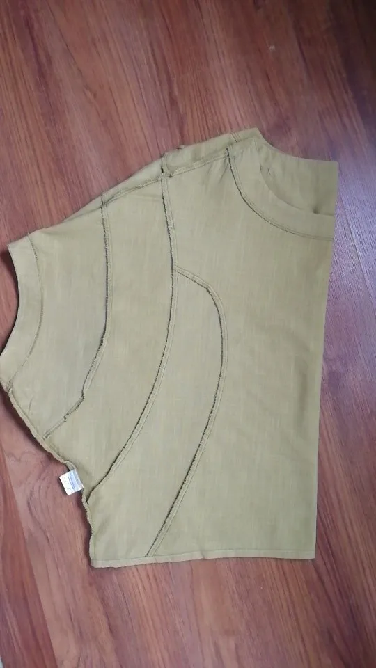 Фасон интересный, цвет совпадает. Состав ткани натуральный. При раскрое не учтена долевая нить и поэтому после стирки перекосило на один бок. Теперь когда её одеваешь, то горловина уходит на один бок и низ разной длиной висит.