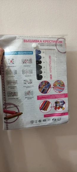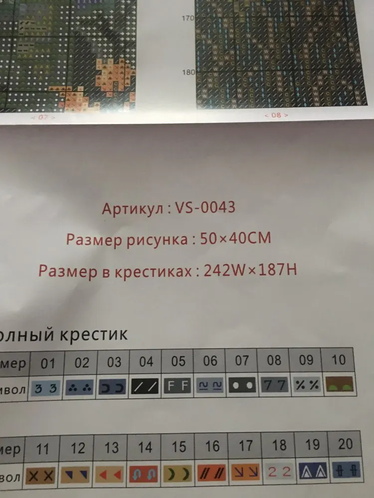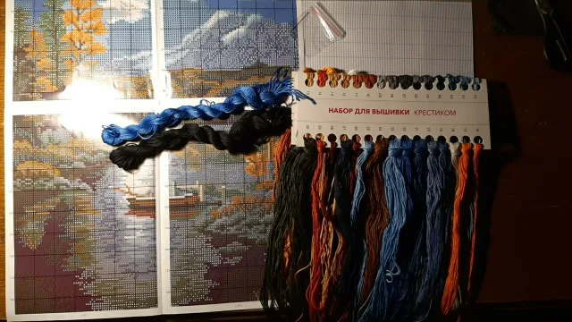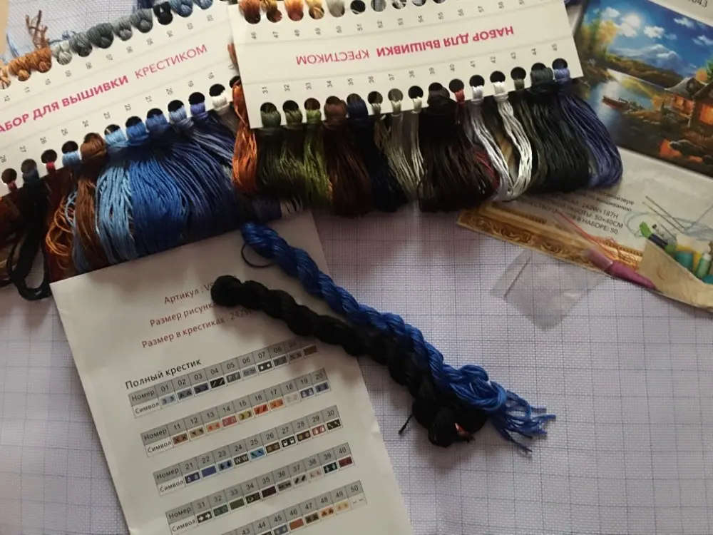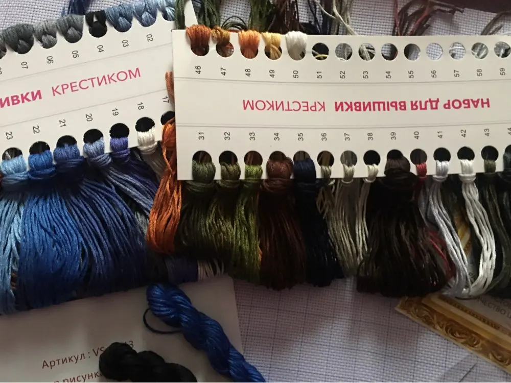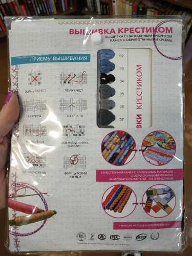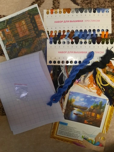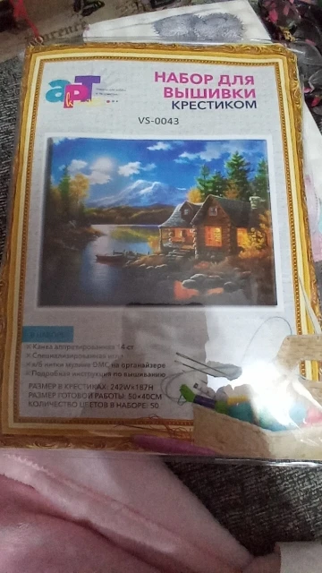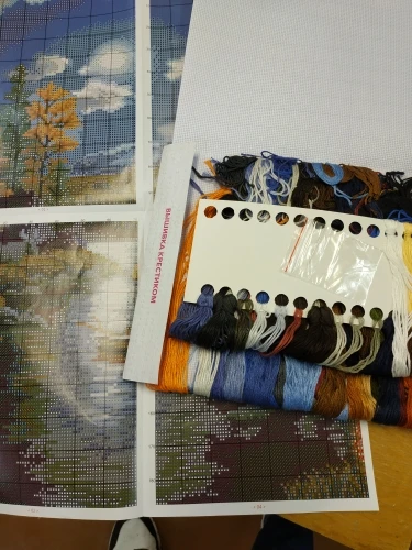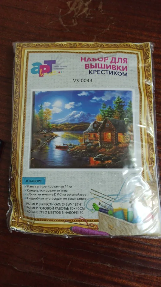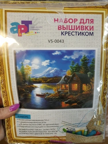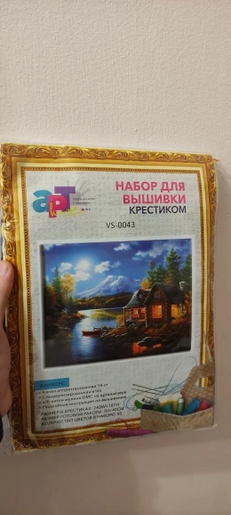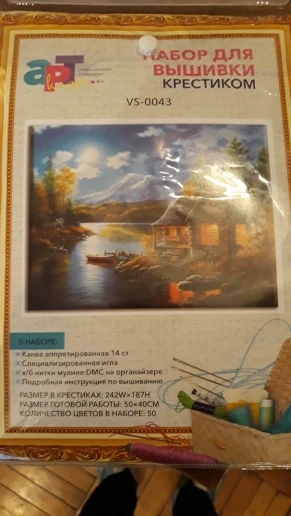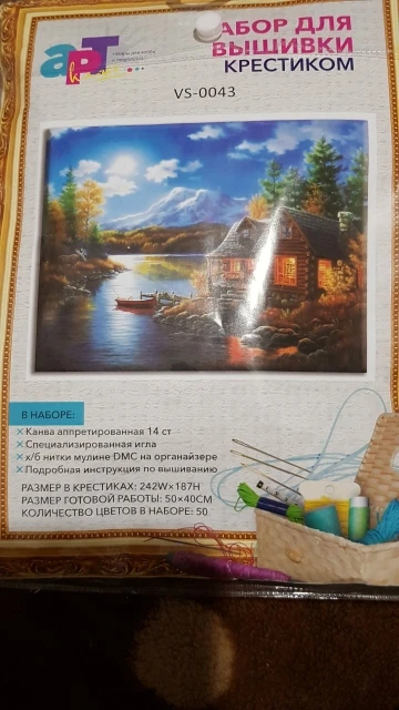 Товар получила быстро . Спасибо большое . Набор состоит из белой канвы , расчерченная, очень удобно , но , по краям не оверложена . В описании указано , что размер изображения 40*50, но , это не так . Размер канвы 42*52 , а изображение будет примерно 34*44 , это существенно меньше . За это сниму звезду Схема читаема , описание на русском языке . В комплекте 1игла и очень красивые нитки , упаковано было аккуратно , в пакет с кнопкой .