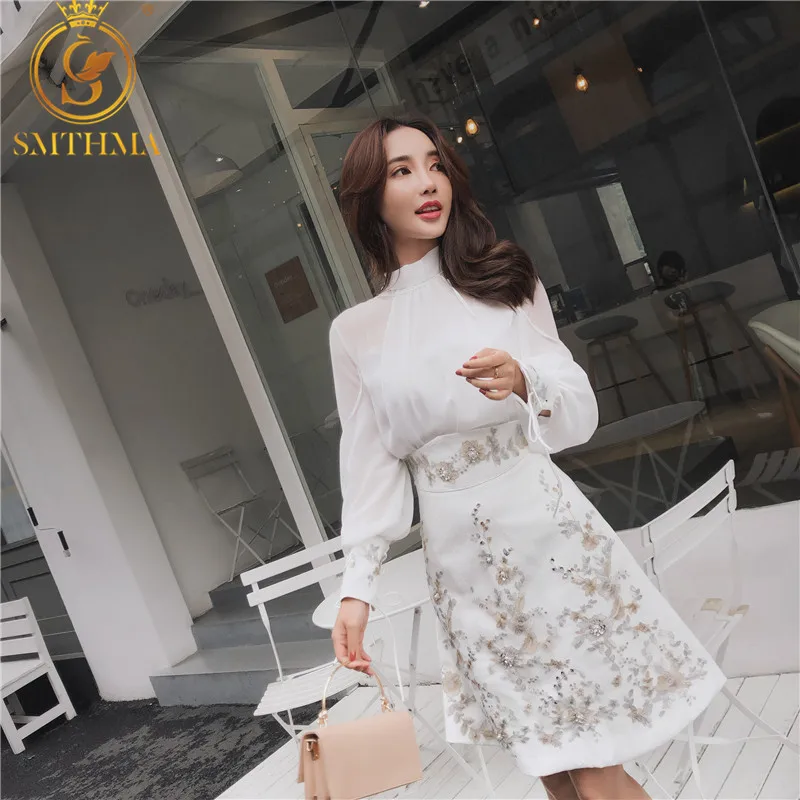 Женский костюм SMTHMA, белая блузка с длинным рукавом и юбка с вышивкой и бусинами, лето 2019