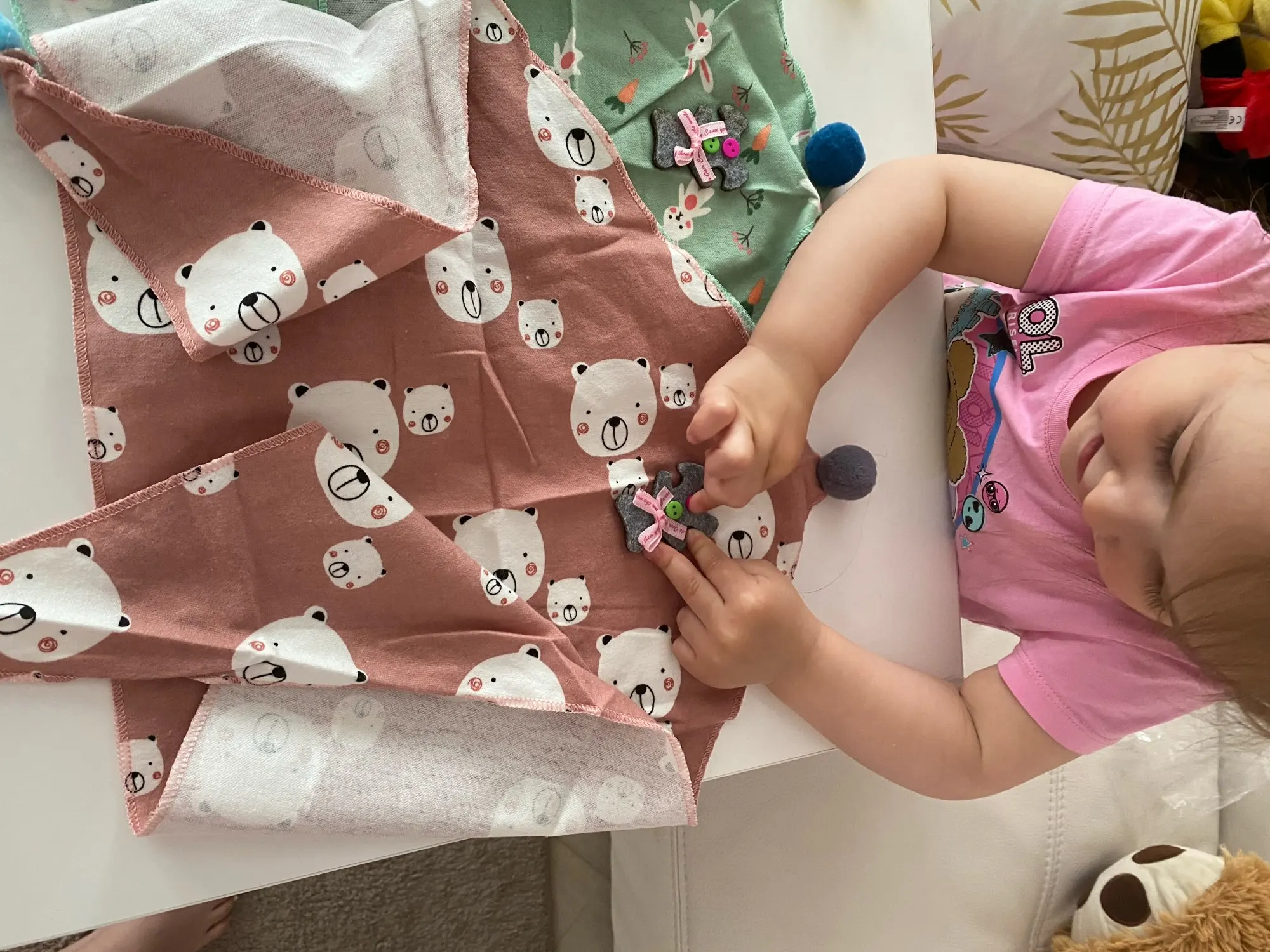 Ткань приятная, типа тонкого флиса, размер для ребёнка отличный, рисунок красивый, помпоны яркие, брошка мишки целая, все аккуратно прошито, односторонний - с обратной стороны нет подкладки, пришло быстро, по почте, хорошо упаковано. Рекомендую