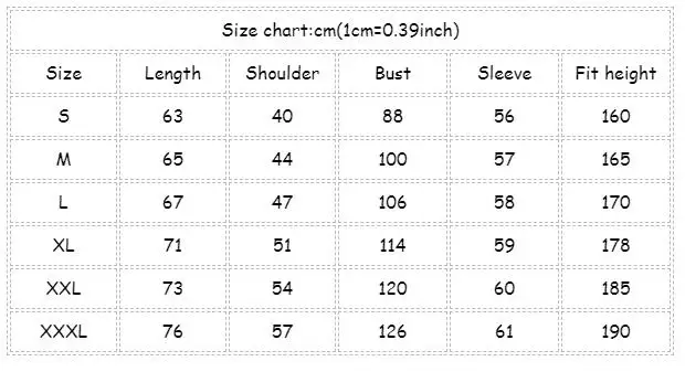 M: ширина плеч 44 см/17,16 дюйма, обхват груди 100 см/39 дюйма, длина 65 см/25,35 дюйма, подходит для роста 165 см