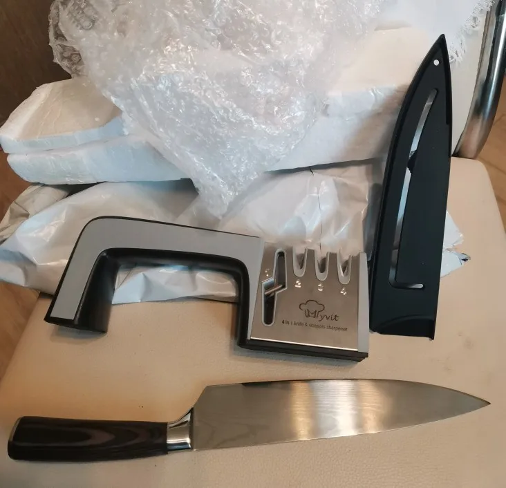 Он прибыл до времени. Острый нож, ножницы, которые я еще не пробовал. Очень рад. Я рекомендую его