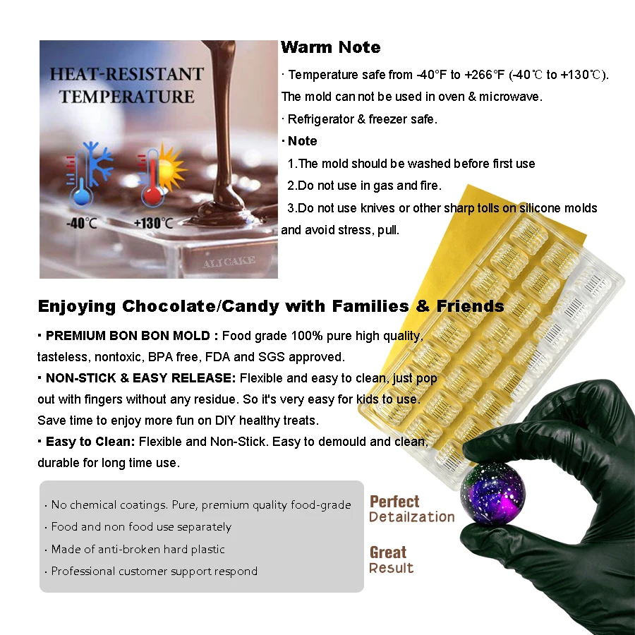 1. Используйте пищевой пластик, соответствующий FDA и SGS.2. Наши формы тяжелее, толще, прочнее и имеют более длительный срок службы!3. Отсутствие вредных веществ, обеспечение безопасности и здоровья!4. Мы осуществляем бесплатный возврат во многие страны!5. Поверхность формы гладкая и не подвержена царапинам.