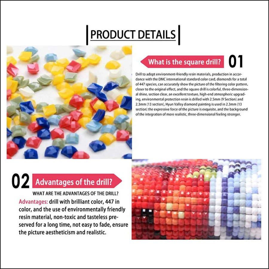 В нашем магазине используются квадратные алмазы из смолы в качестве сырья, и у нас есть два стиля алмазов: девять краев и тринадцать краев. Сочетание этих двух стилей сделает картину более элегантной по текстуре с сияющей яркостью. По сравнению с традиционной смоляной росписью, наши работы имеют более сильное чувство стереофографа и роскоши, прекрасно выраженные в новом стиле смолы алмаза, стоя за ваш элегантный вкус для украшения дома!