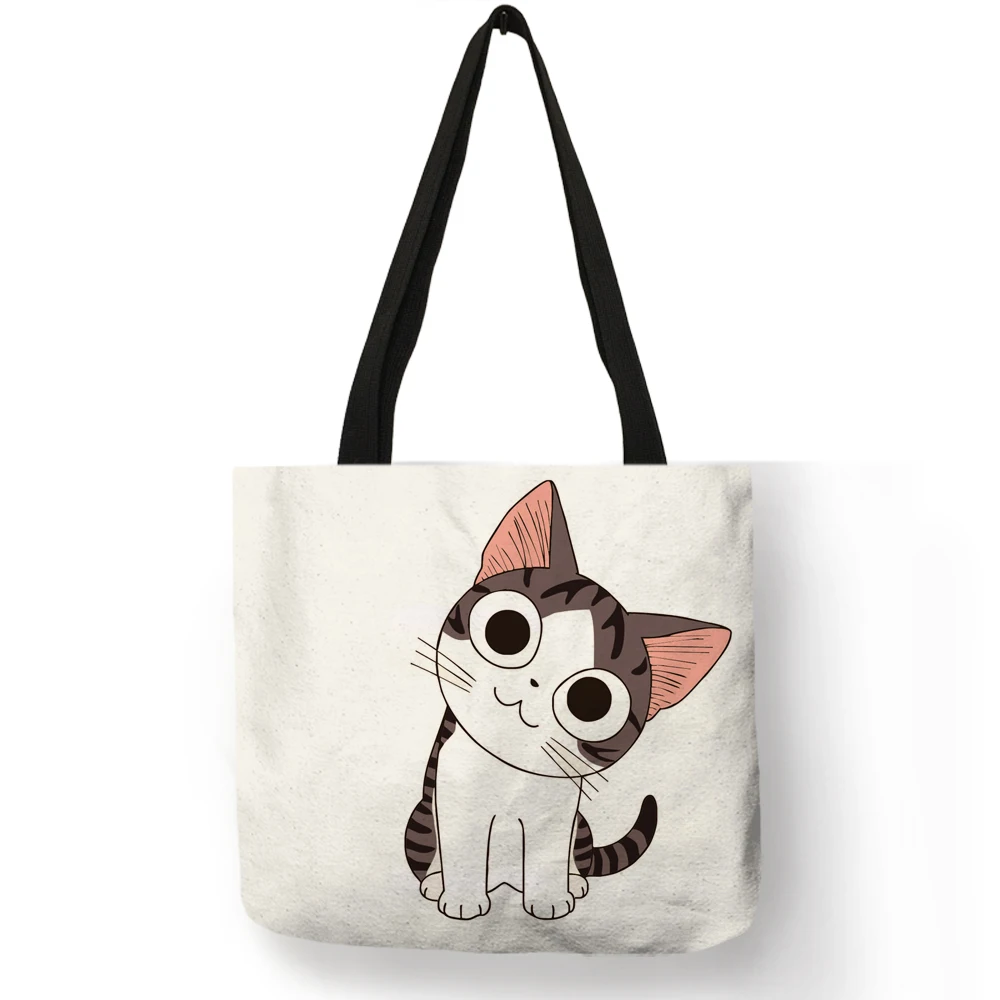 Простые сумки в мультяшном стиле, сумки-тоуты из эко-льняной ткани с улыбающимся котом для покупок, путешествий, офиса, многоразовая сумка через плечо