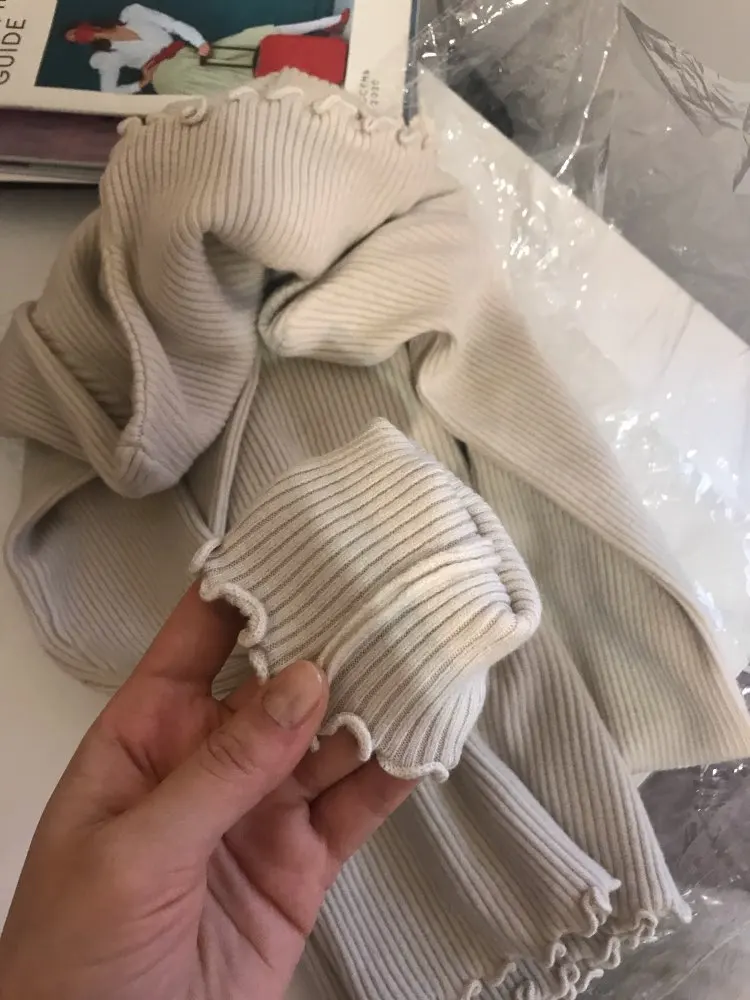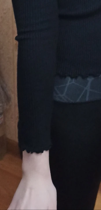 ткань мягкая, торчали нитки, но я их перетянула на выворотную сторону без надобности обрезать их. рукава довольно короткие, но не критично (у меня рост 168). в целом покупкой очень довольна, такие гольфики в шоурумах по 400грн продают.
