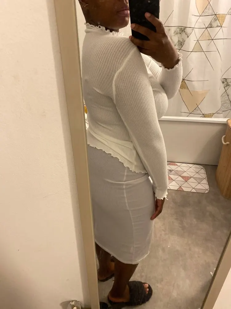 Выглядит как на фото, но не советую брать крупным, наверно после М не стоит потому что обтягивает сильно, все недостатки будут видны