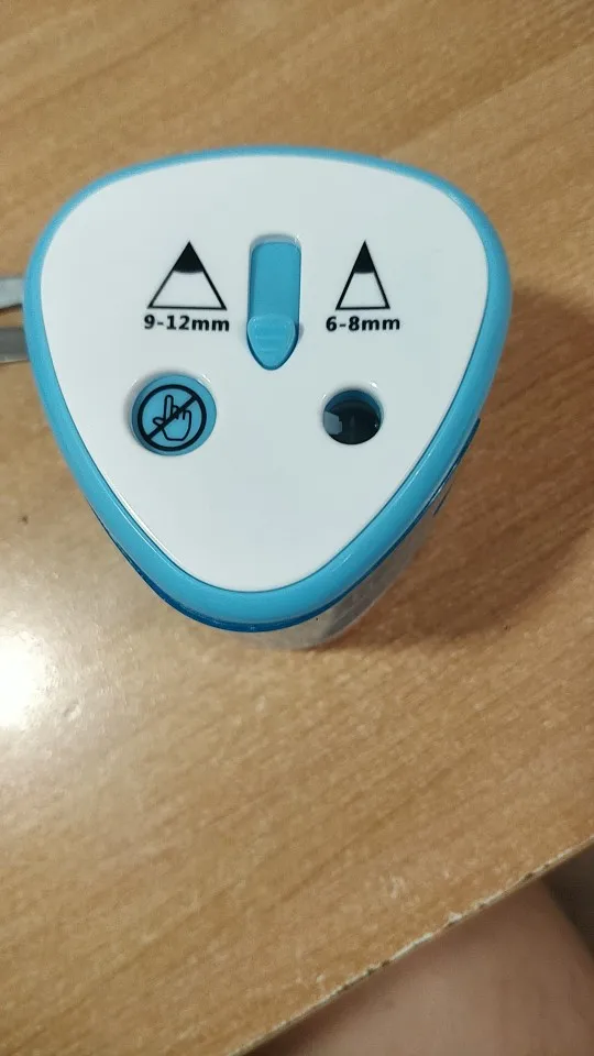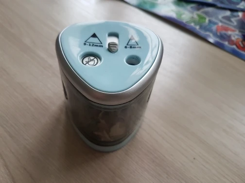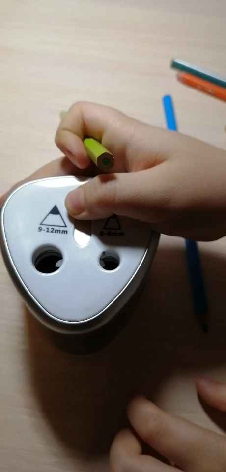 Классная точилка. Дети игрались целый вечер, все карандаши поточили сами. Удобно. Два отверстия для толстых и тонких карандашей. Большое отверстие закрыто пластиной, которую нужно отодвигать. На ней предупреждение не совать пальчики. Работает точилка на 4 пальчиковых батарейках.