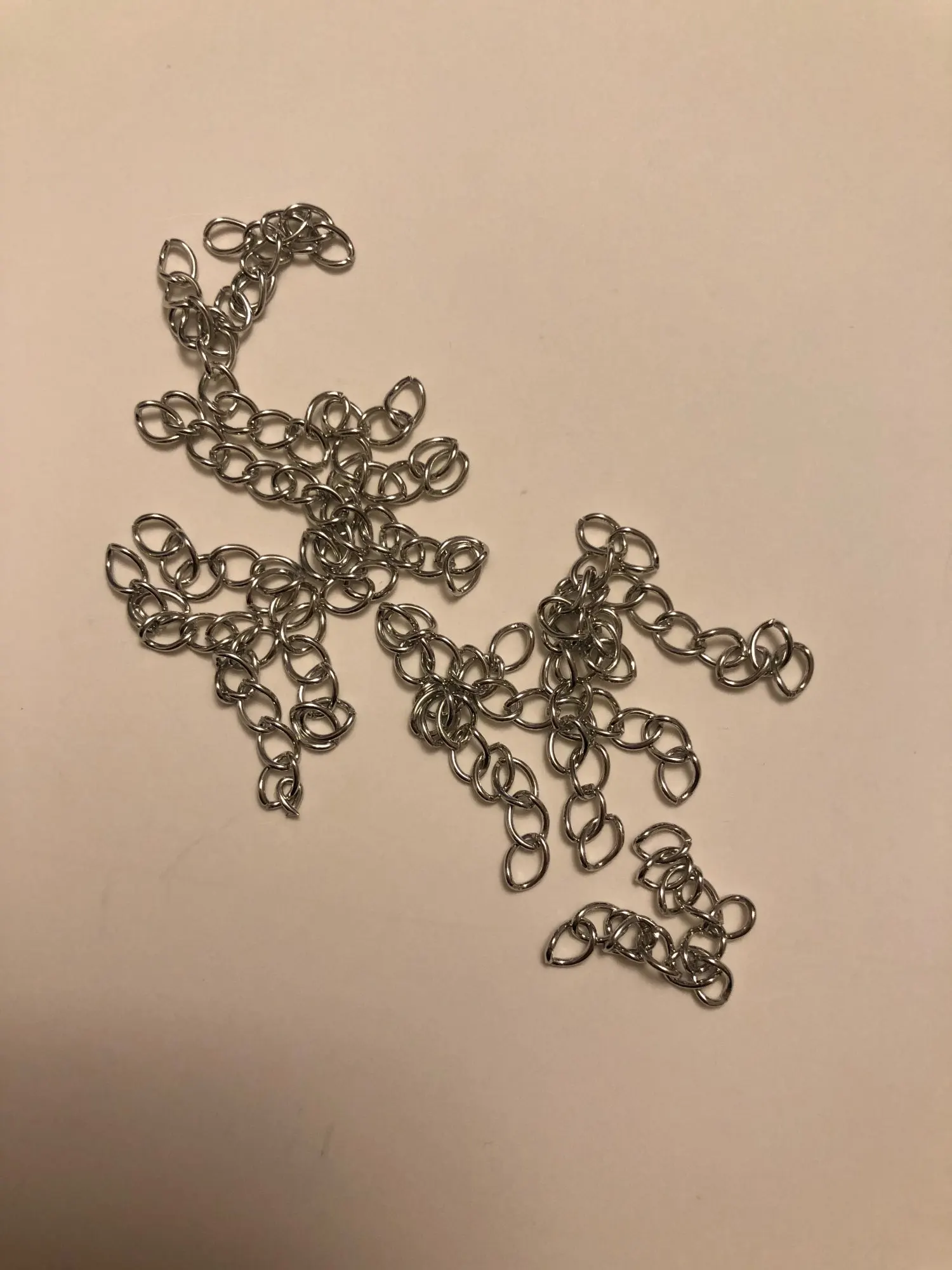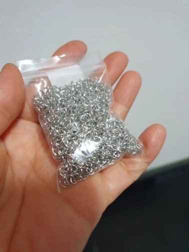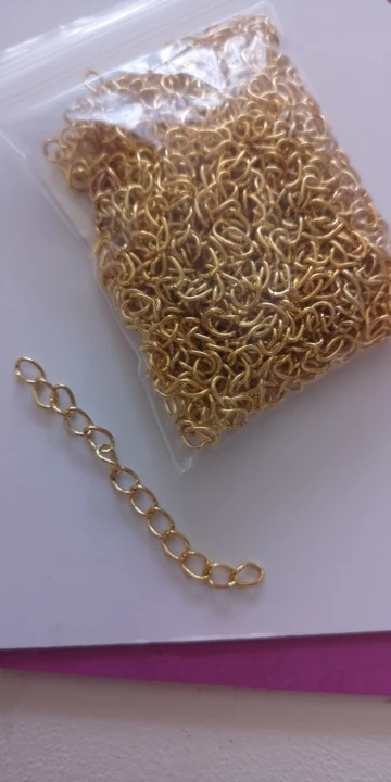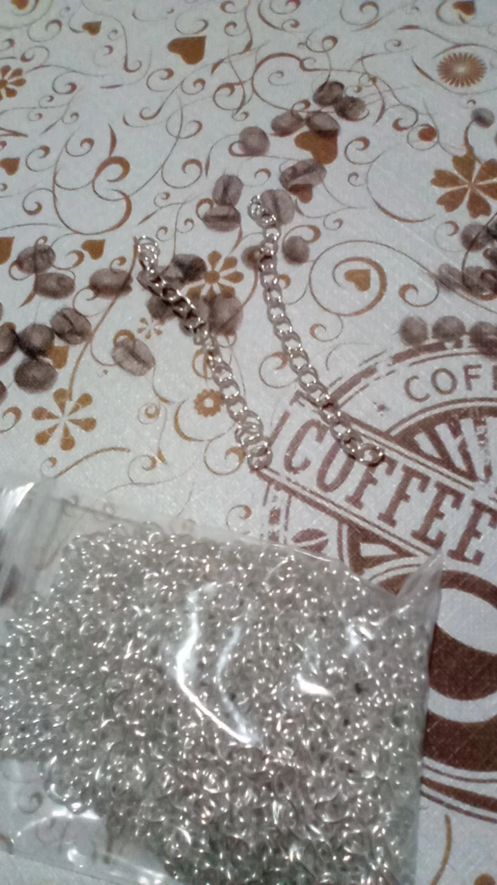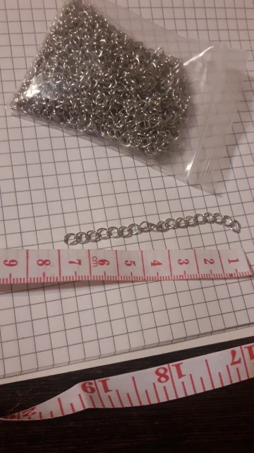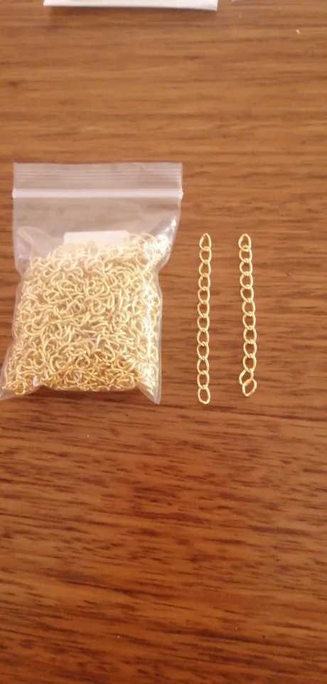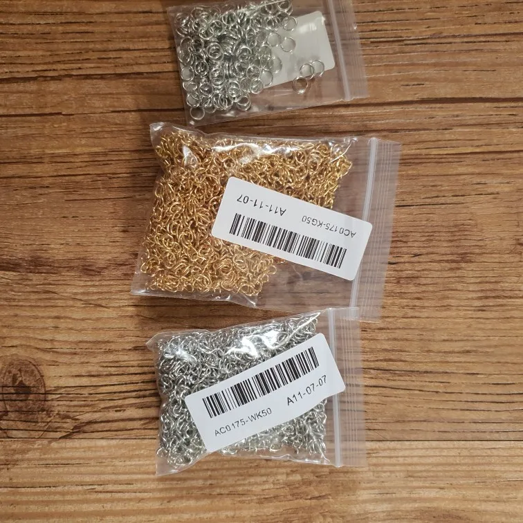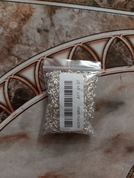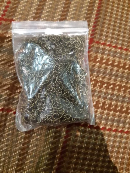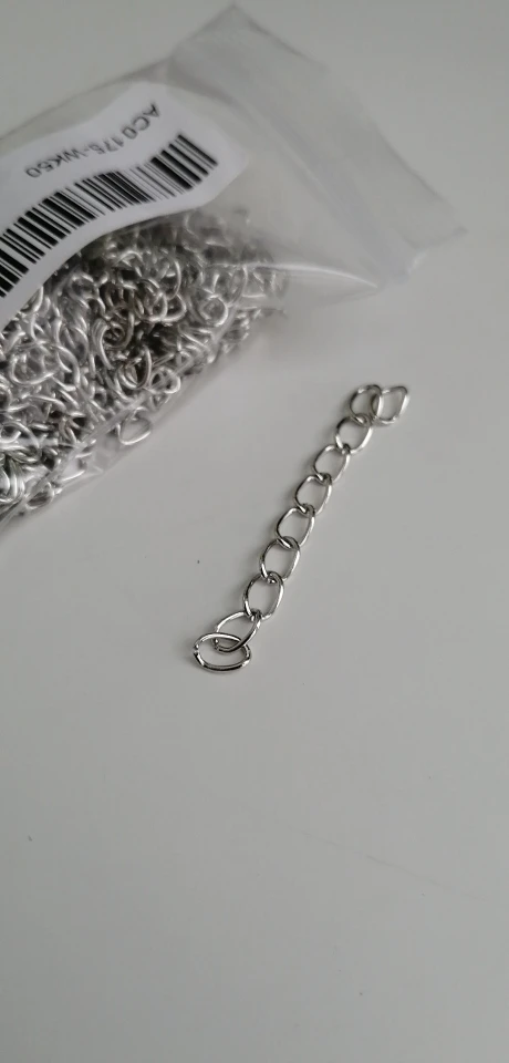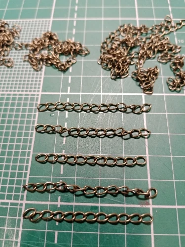 Шла посылка довольно долго. Кинули в почтовый ящик. В упаковке 107 цепочек. Есть маленькие лишние детальки, но это не страшно, потому что по количеству всё в порядке. Цепочки ровно 5 см, некоторые чуть чуть длиннее.