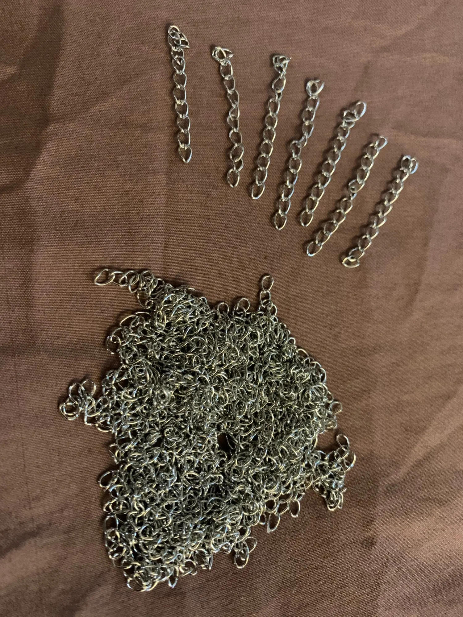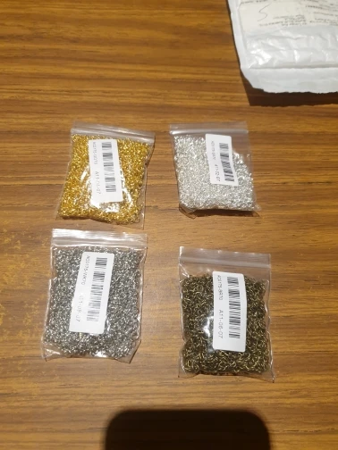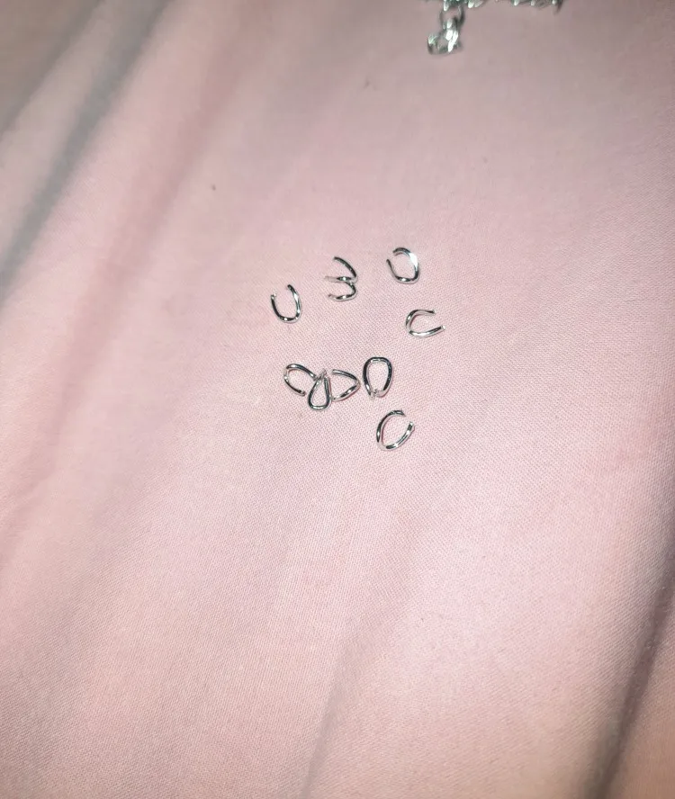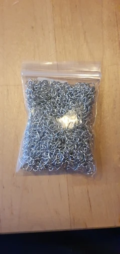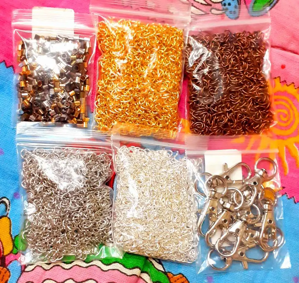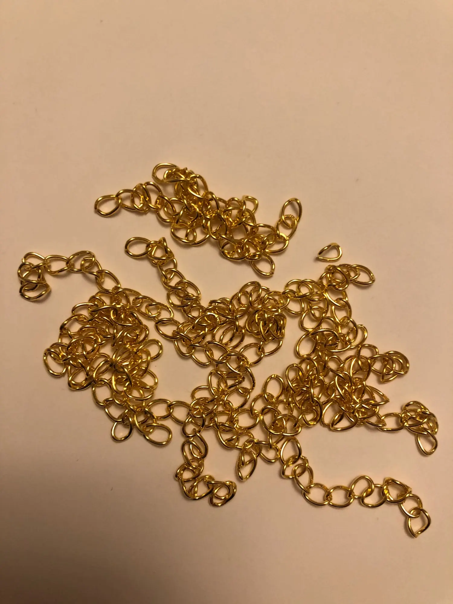 Шла посылка довольно долго. Кинули в почтовый ящик. В упаковке 107 цепочек. Есть маленькие лишние детальки, но это не страшно, потому что по количеству всё в порядке. Цепочки ровно 5 см, некоторые чуть чуть длиннее.