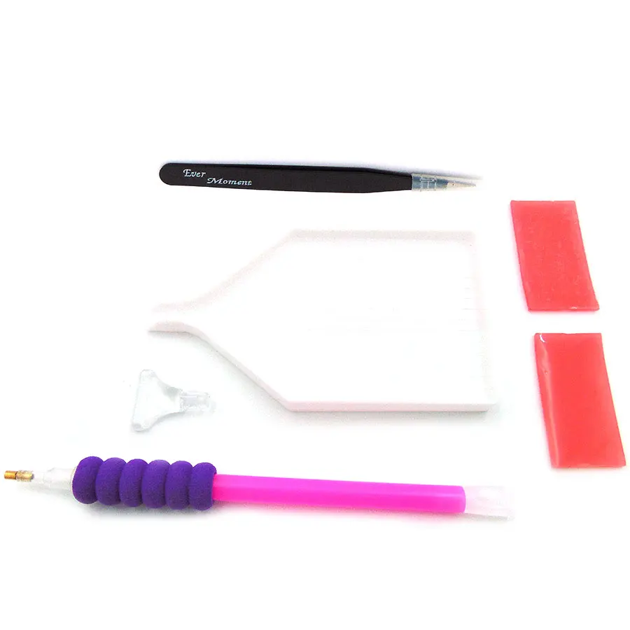Инструменты включают в себя: ручка (различные точки ручки для наклеивания 1, 3 или 6 бриллиантов), алмазная пластина, клей, пинцет