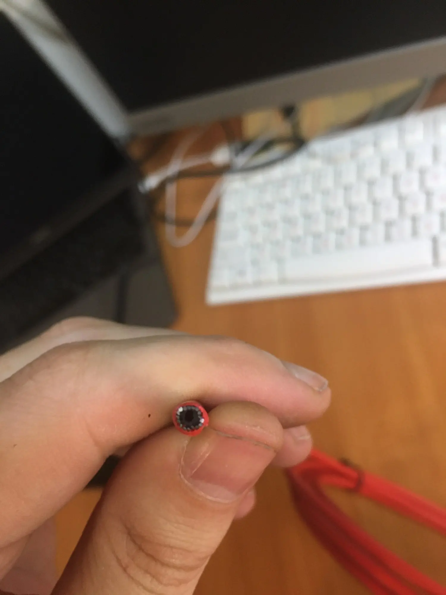 Довольно жесткий кабель, единственная вещь, которая отмечала свой бренд серебром каждые 30 см. Он удаляется спиртом.