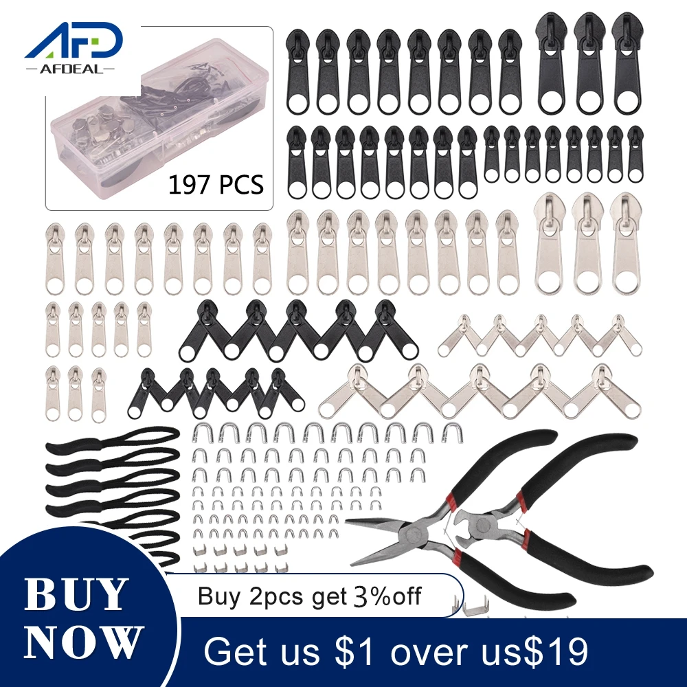 197 шт., Ремонтный комплект на молнии, сменные слайдеры, инструменты для установки плоскогубцев, нейлоновый шнур, застежка-молния, фиксатор, Нескользящий Захват с коробкой