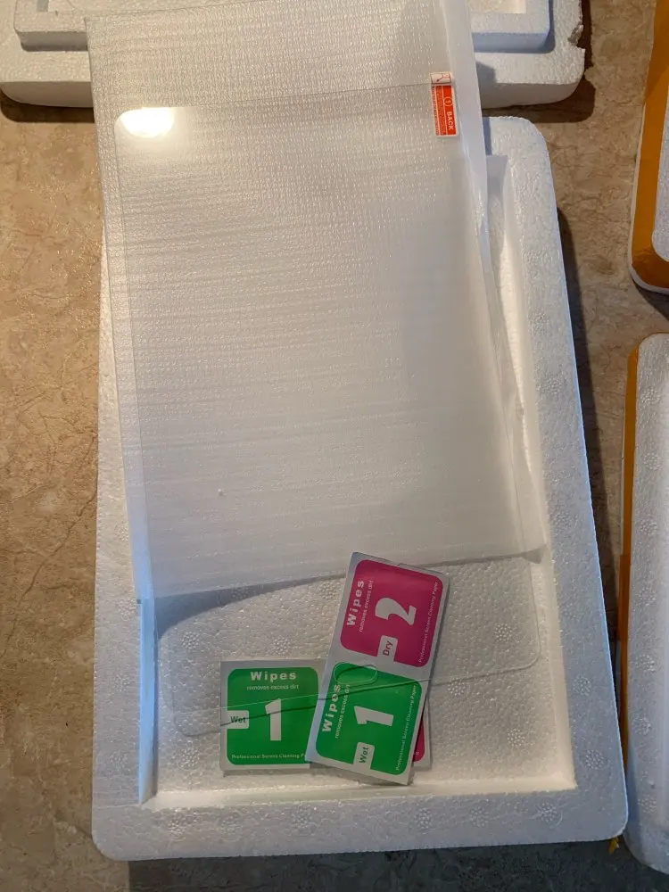 Продукт, который прибыл хорошо упакованным и с приемлемым временем доставки. Он хорошо закрывает весь экран и без проблем работает на ощупь. Поставляется с салфетками для установки. Единственным недостатком является то, что у него нет отверстия для передней камеры.