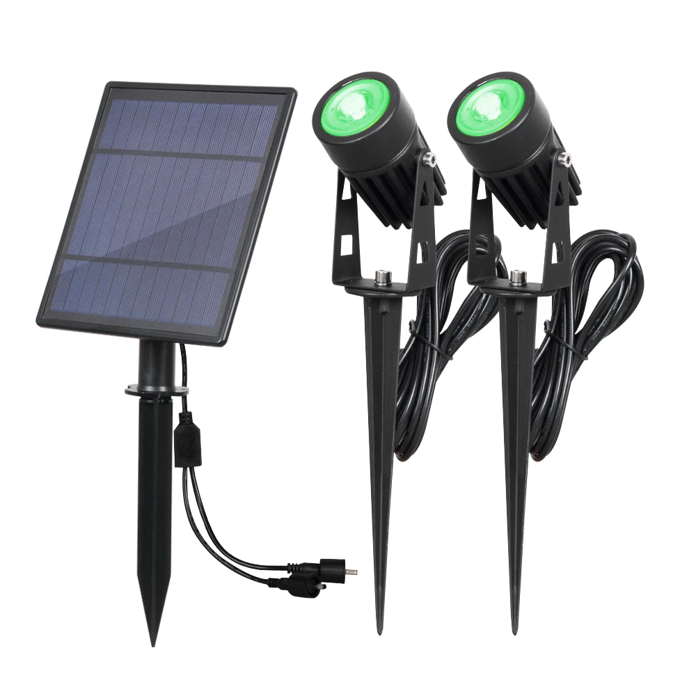 Характеристики:Солнечная панель: 5 В/2,5 ВтМощность: 1 Вт * 2 шт.Цвет: зеленыйФлюс: 130 люмен на светильникУровень водонепроницаемости: IP65Время зарядки: >8 часовВремя работы: около 8- 9 часовАккумулятор: литиевый аккумулятор 18500 3,7 в, 2200 мАчИсточник питания: на солнечной энергииРасстояние освещения: 15 мУгол свечения: 30 градусов (светильникРегулируемый угол: 270 градусов (солнечная панель); 270 градусов (Солнечные прожекторы)Метод работы1. Включите переключатель на задней панели солнечных батарей и установите солнечную панель, обращенную к солнечному свету, для зарядки встроенного аккумулятора.2. Вдавите кол в землю. Поставьте светильник куда угодно.3 светильник будет работать автоматически в темноте при достаточном количестве батарей.Важная информация1. Поскольку мощность солнечной панели зависит от солнечного света, на время светодиодного освещения влияют погода, Времена года, места и т. д.2. Убедитесь, что солнечная панель не защищена от солнца, иначе светильник будет плохо заряжен.3. Аккумулятор можно заряжать только тогда, когда включен переключатель на задней панели солнечной батареи.4. Сделайте солнечную панель лицом к лицу для защиты от дождя. Держите патрон лампы подальше от воды.5. Не наносите ударов по изделию, чтобы не нанести необратимые повреждения.6. Кол настолько острый, что при использовании следует быть осторожным. И не позволяйте детям играть с нимПосылка1 солнечная панель2 прожектора с кабелем 2,88 м3 шипа1 комплект винтов2 прожектора