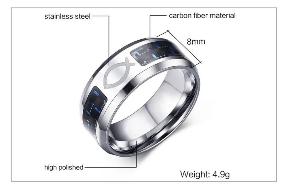 Vnox Прямая поставка 8 мм из нержавеющей стали Иисуса Христианские кольца с рыбками для мужчин женщин мужчин религиозная вера кольцо с синим углеродным волокном