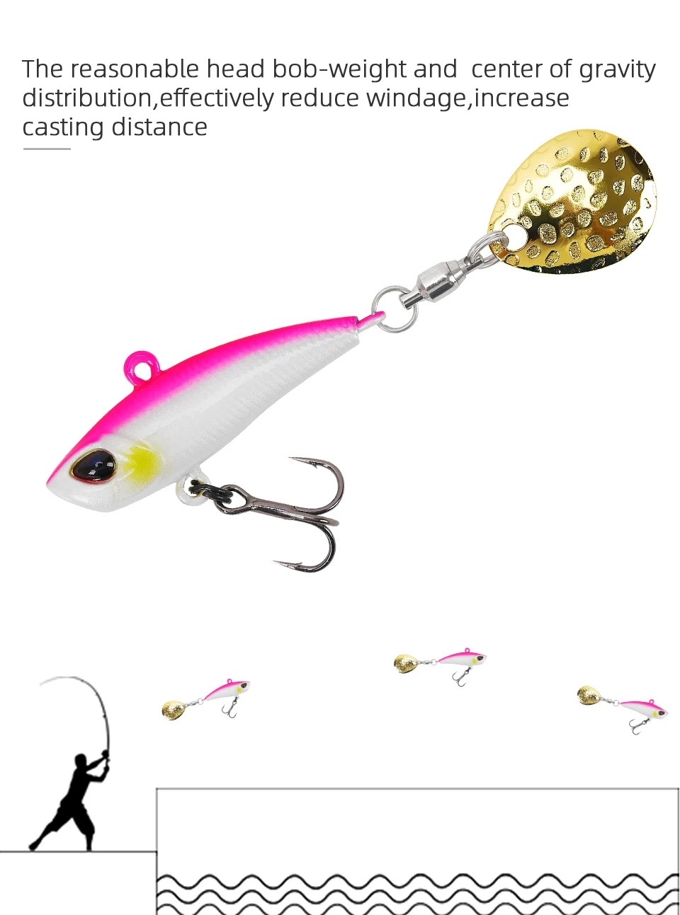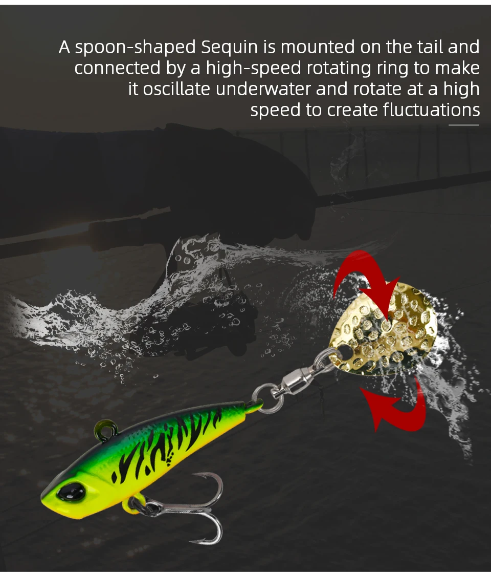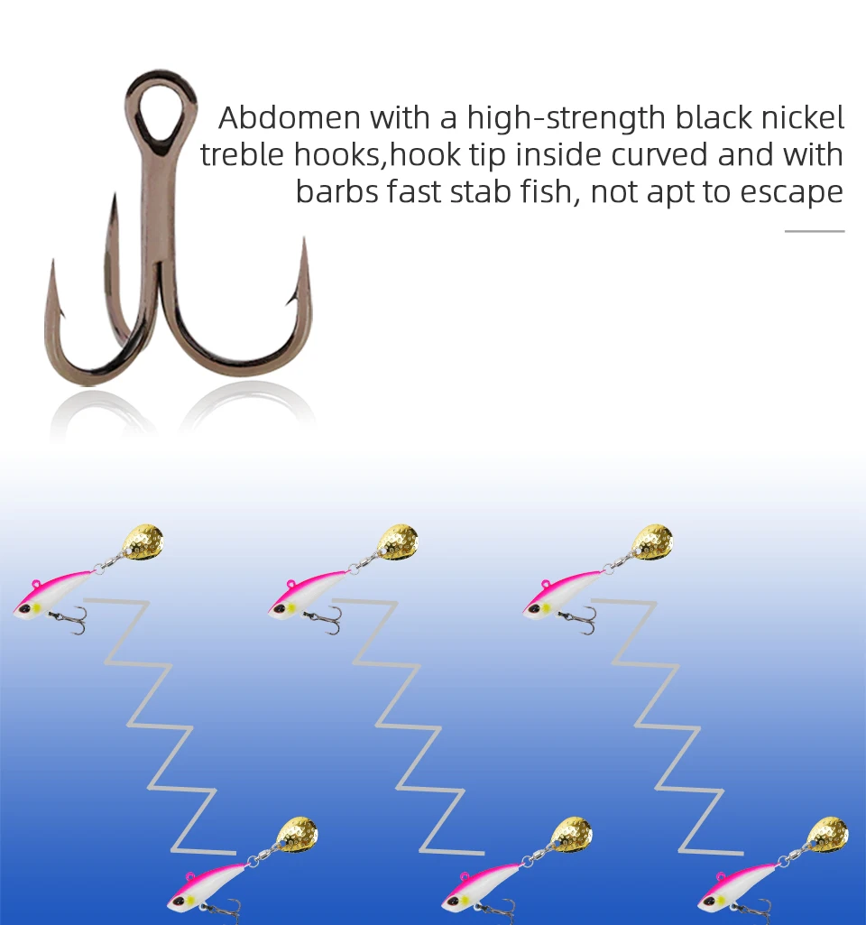 Пайетки в форме ложки крепятся на хвосте и соединяются высокоскоростным вращающимся кольцомРазумный вес головы и распределение центра тяжести, увеличивает дальность забросаПайетки со шлейфом соединены высокоскоростным вращающимся стержнем, который может качаться и вращаться на высокой скорости под водойЖивот с высокопрочными тройными крючками из черного никеля, кончик крючка внутри изогнут и с зазубринами быстро ударит рыбуНаклонная головка приманки, попадая в воду, она может разбрызгивать и привлечь мишенью рыбуГоловка выпуклость, и центр тяжести движется вперед, что позволяет лучше избежать препятствий и снизить вероятность подвешивания дна