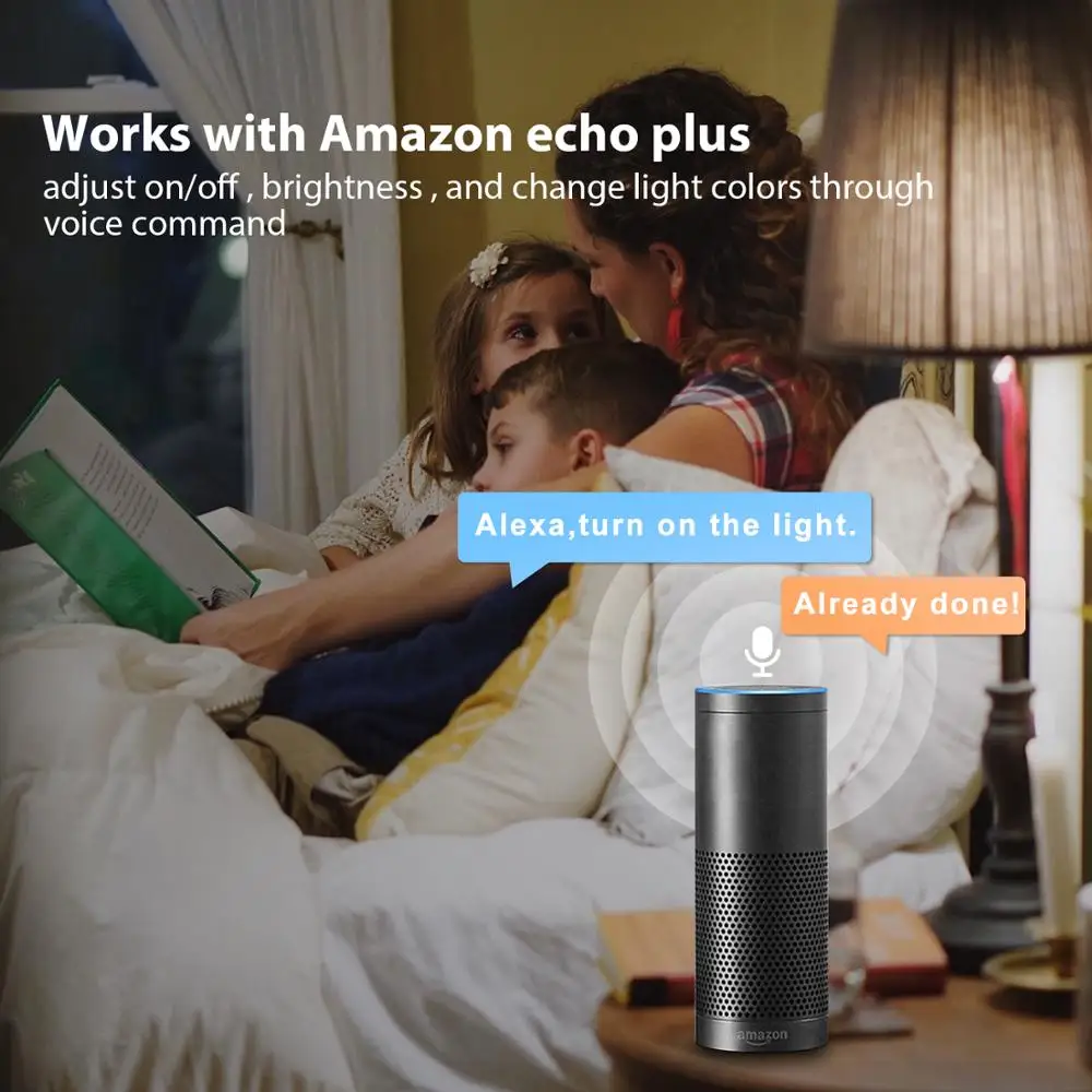 Голосовое управление: работает с Alexa Echo Plus, голосовое управление вашими светодиодными лампами E26, разговаривая с Amazon Alexa, вы можете включить/выключить, изменить цвет, затемнить/осветить лампы E26 RGB.