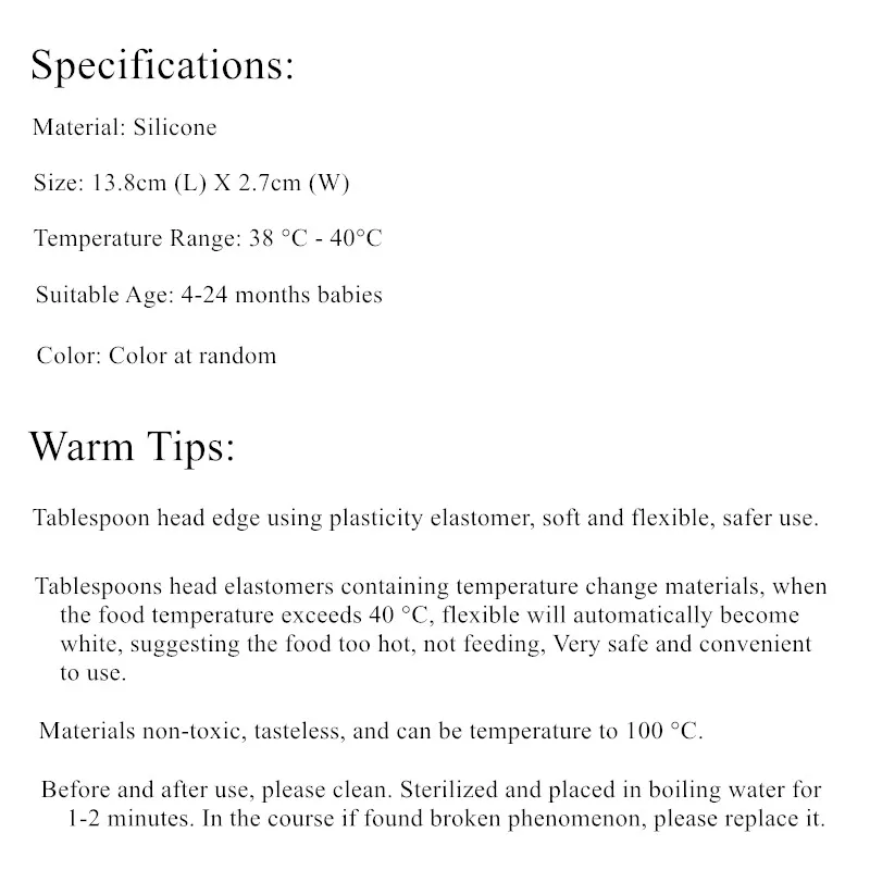 Это отличный продукт. Изготовленная из силикона с датчиком температуры, ложка станет прозрачной, когда температура пищи превышает 38 °C. Пожалуйста, положите еду на ложку, чтобы проверить температуру перед кормлением ребенка.