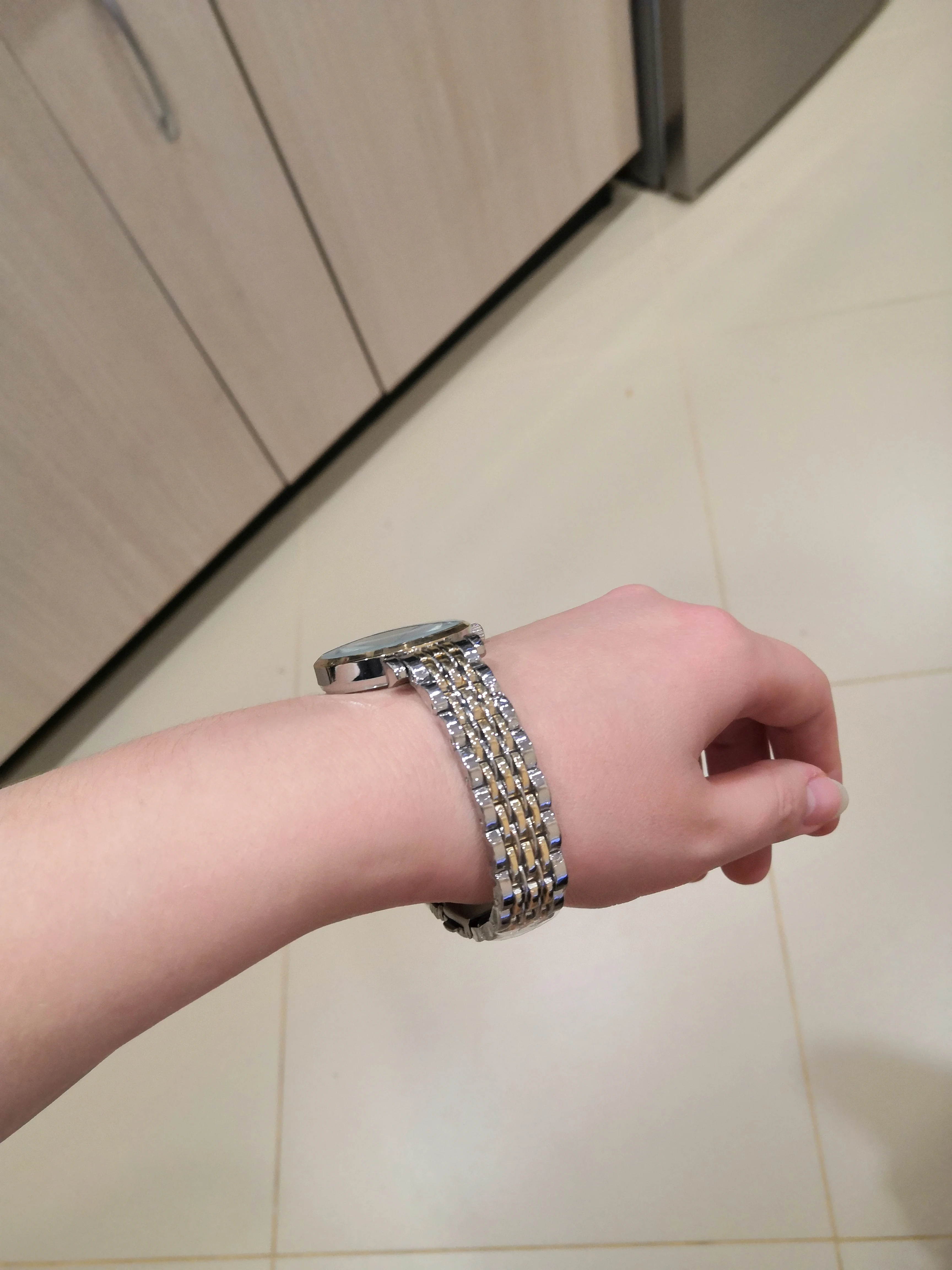 Часы по качеству хорошие, немного тугой механизм прокрутки и настройки времени. Ремешок рассчитан на полную руку, запас большой, придётся вынять по одному звену. В общем довольна часами. Доставка месяц.