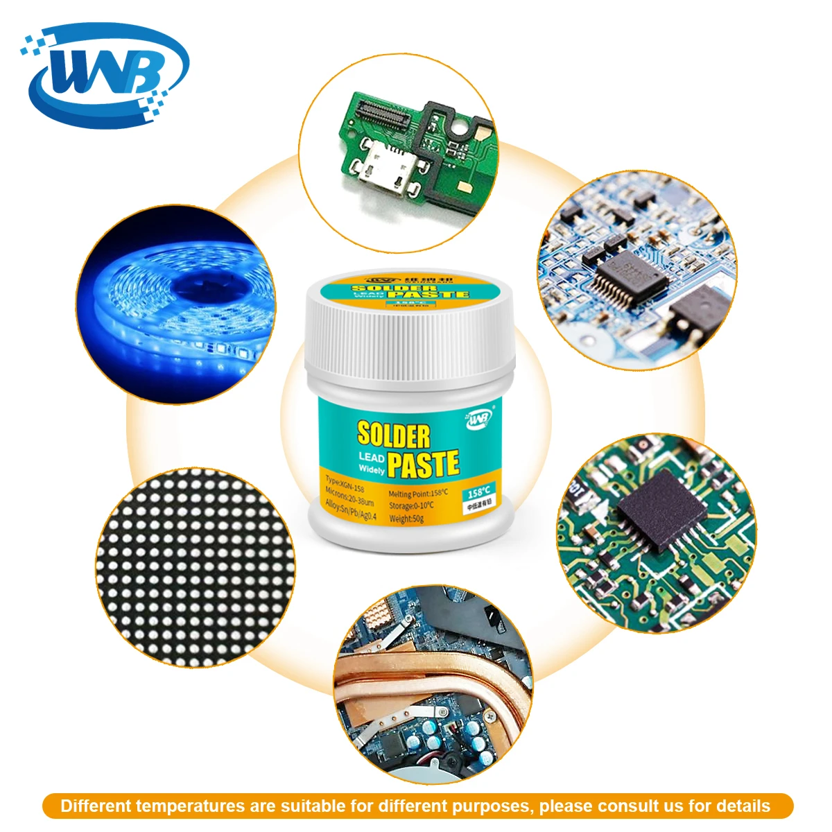 Специальный SMDВысокое качество, уникальная формула, идеальная производительность, легко сварить, паяное соединение яркое и полное, без сварки, феномен ложной сварки.Широко применимыйАдаптирован к индустриям ремонта мобильный телефон, компьютерная цифровая сервисная промышленность и высокоточная паяльная плата SMD/BGA.Выразительный и деликатныйУникальная высококачественная паяльная паста, тонкая и гибкая упаковка (50 г/бутылка), нежный внешний вид.