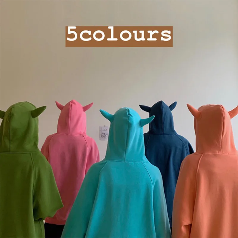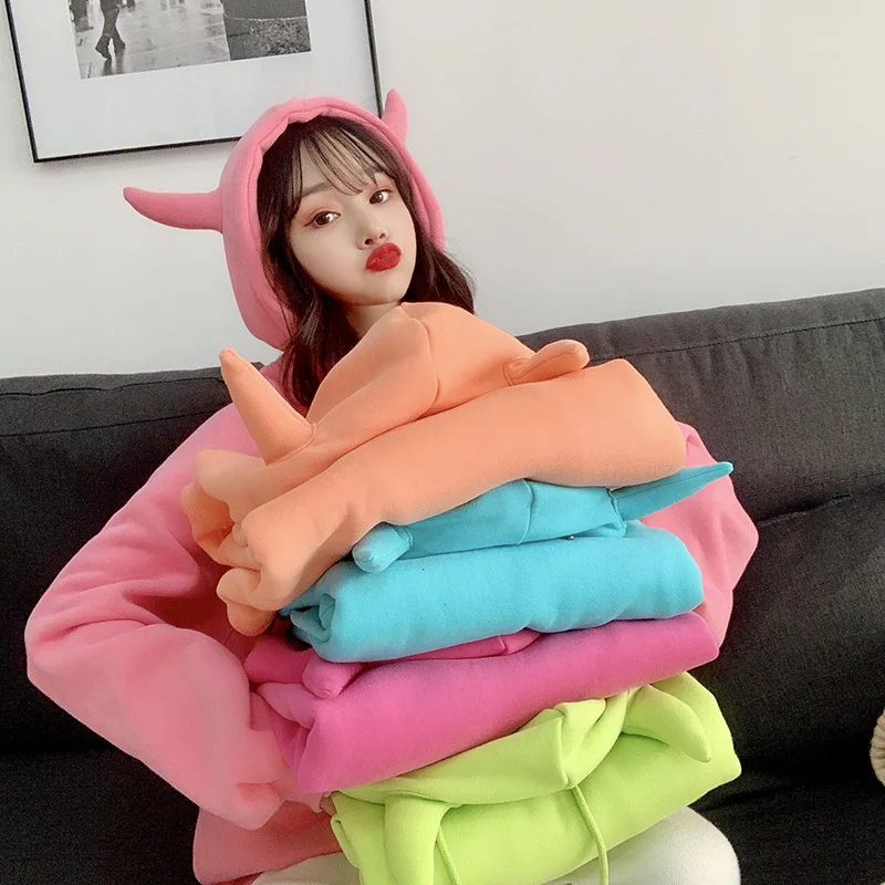 Женская толстовка с капюшоном, Вельветовая теплая Свободная Толстовка в стиле Харадзюку с рогом дьявола, милые пуловеры, топы, весна 2020