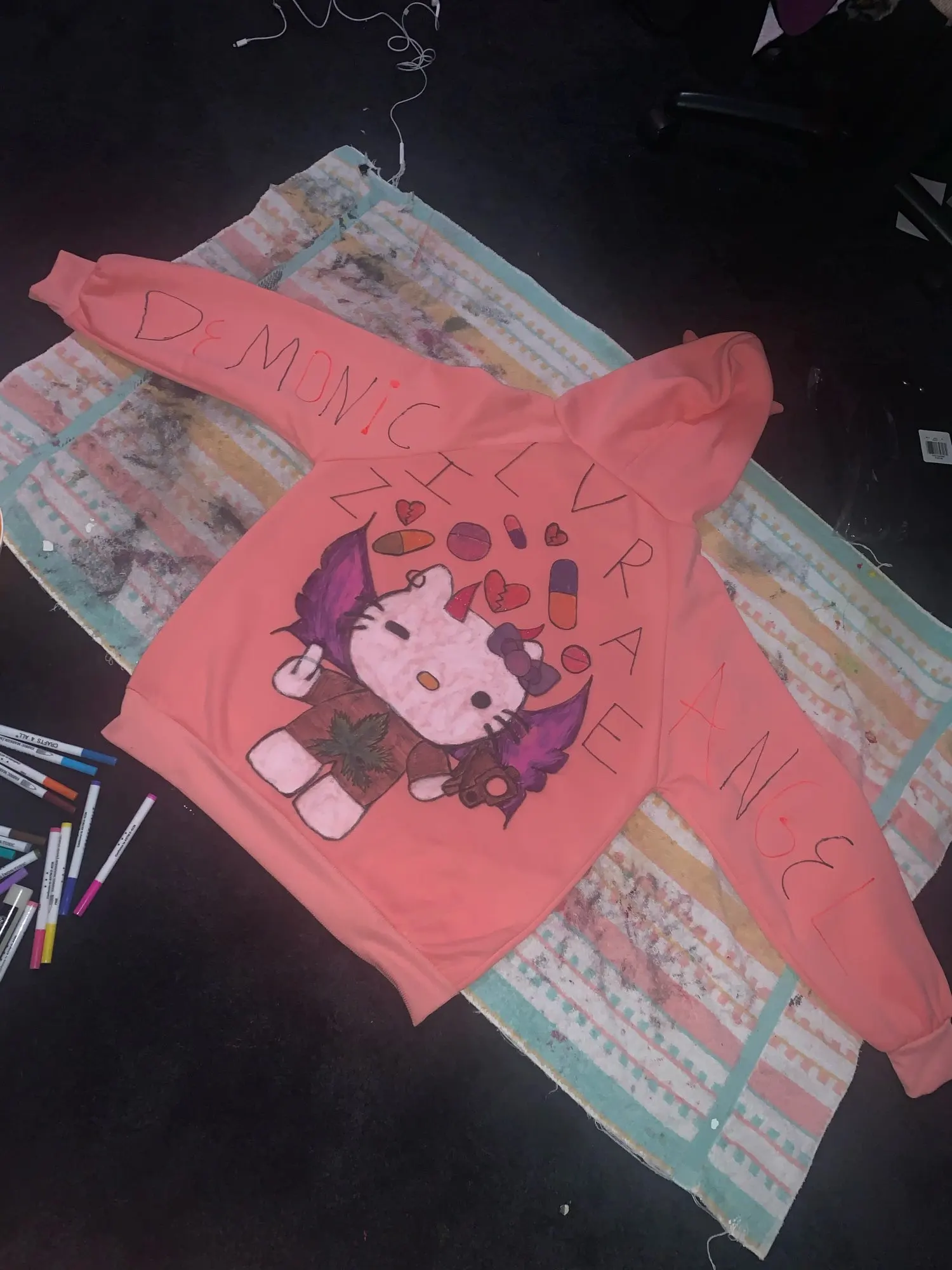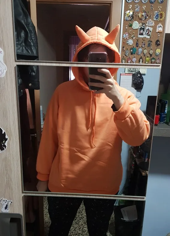 Толстовка очень клаасная, мягкая, рожки стоят устойчиво, цвет немного отличается, он более яркий неоновый и в руках маломерит, но все равно все прекрасно