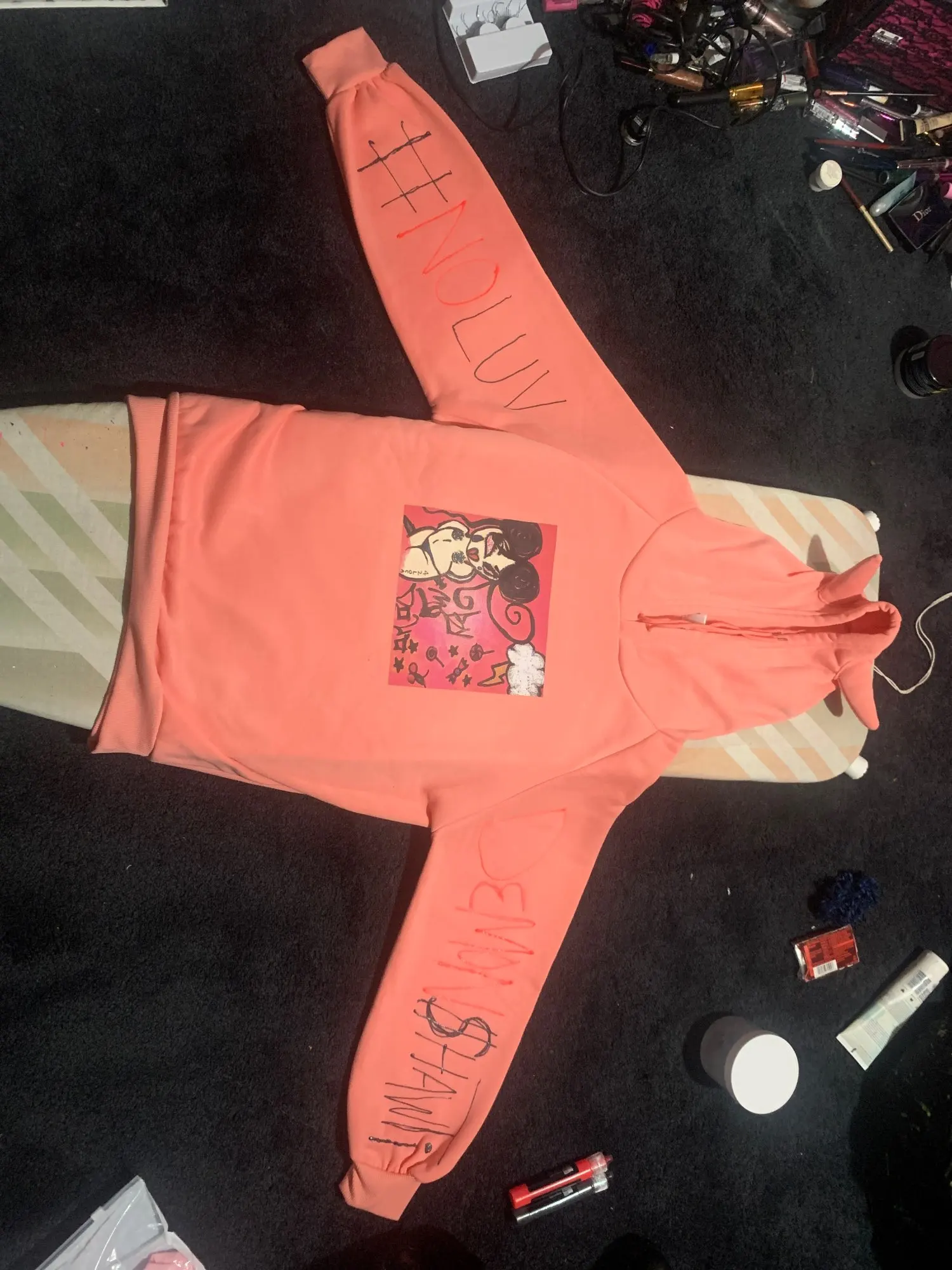 Цвет и рисунок соответствуют фотографиям. Но рукава короткие. Даже с XXL, они действительно короткие. Внутри ткань очень мягкая! Немного тонкий, но все в порядке. Проблема только в рукавах TT_TT Это фантастическая супер милая толстовка!