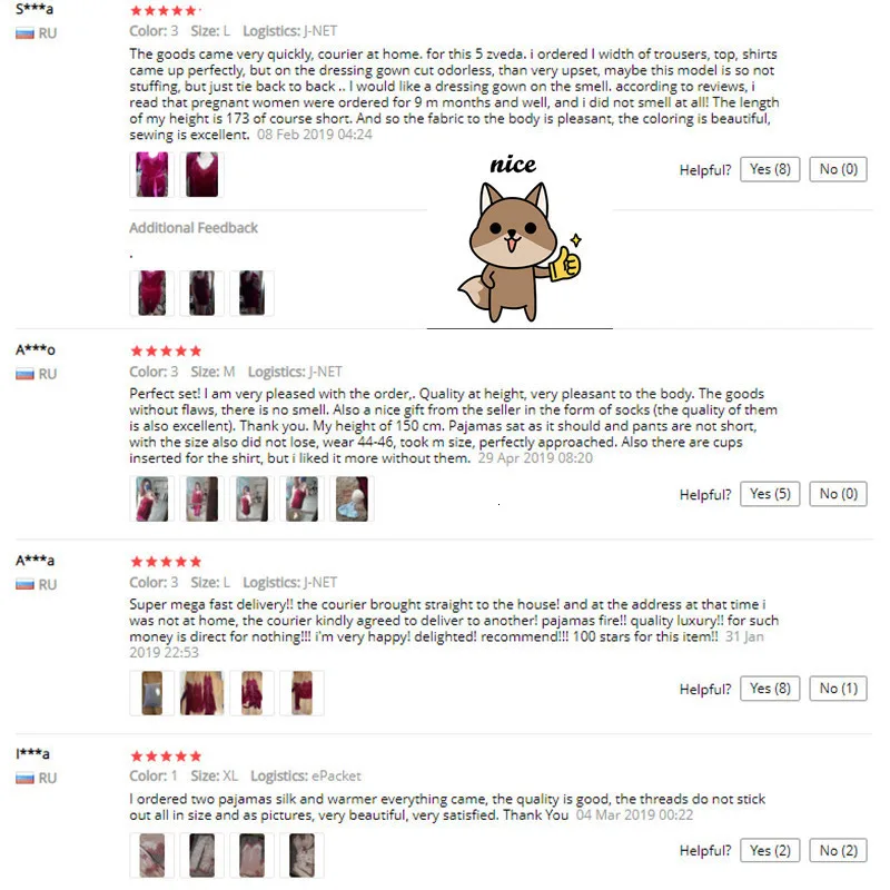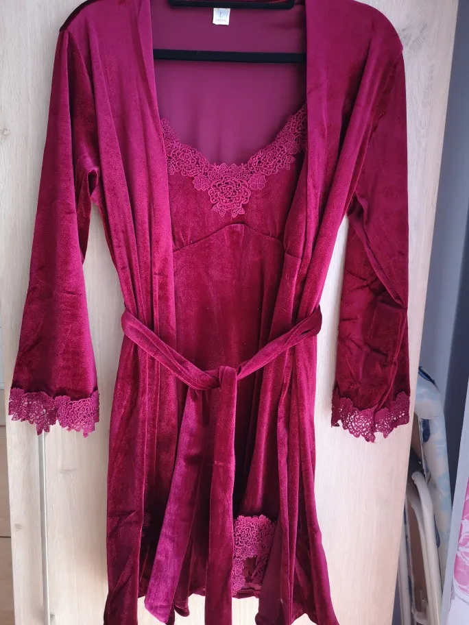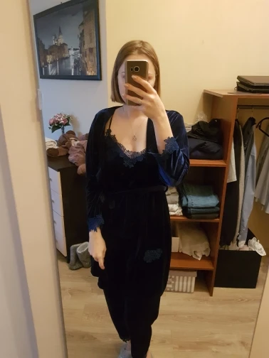 Заказ оформлен 19 сентября, отправлен 21 и поступил в почтомат 9 октября (Вильнюс). Довольно быстро, в принципе. Качеством довольна - приятная ткань, только на халате на рукаве торчат нитки (плюс, нитки были по всему набору, но легко снимались). Также мне прилетел привет от упаковщиков в виде черного волоса (не очень приятно, ну да ладно - бывает). На ОГ 90 ОТ 70 ОБ 100 взяла размер L. Сел хорошо, но, в принципе, можно было бы и побольше размер взять, чтобы не плотно облегало, а было прямо свободно-свободно (ещё раз: размер L сел отлично). В целом довольна - посмотрим, как поведёт себя ткань после стирки.