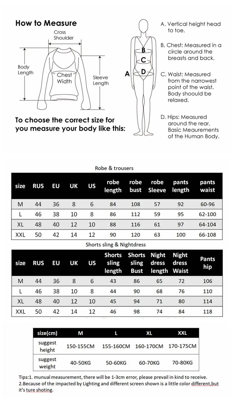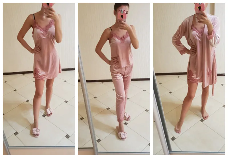 Очень классный набор, качество огонь) на параметры 95/72/95 вес 62кг рост 158, размер груди 4, взяла L, русский ношу 44-46. Брюки сели идеально, и по длине и по размеру, у халата непонятная длина рукава, не полная и не 3/4 где-то посередине))) топ и ночнушка в самы раз не давит, но грудь больше в этот размер не влезет, сидит классно и без чашек, пришло супер быстро, 10 дней