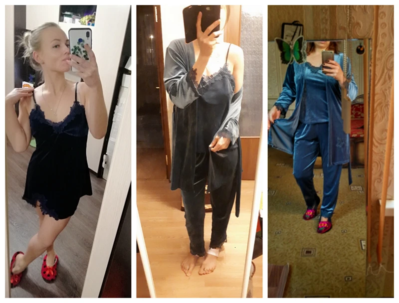 Заказала 13.11, курьер привёз домой 24.11 в мск. За 1500 руб. нормальный домашний костюмчик. Ткань синтетика, но приятная на ощупь. Нитки местами торчат, но не критично. Немного смущает кружево на халатике и штанах, но его можно убрать. Чёрные лямки на майке и рубашке розового цвета тоже были неожиданностью)) и да, как уже писали здесь все, штаны спереди некрасиво ложатся. На ОГ 92 - ОТ 75 - ОБ 102 размер XL подошёл в самый раз - не облегает и не висит. С продавцом не общалась.
