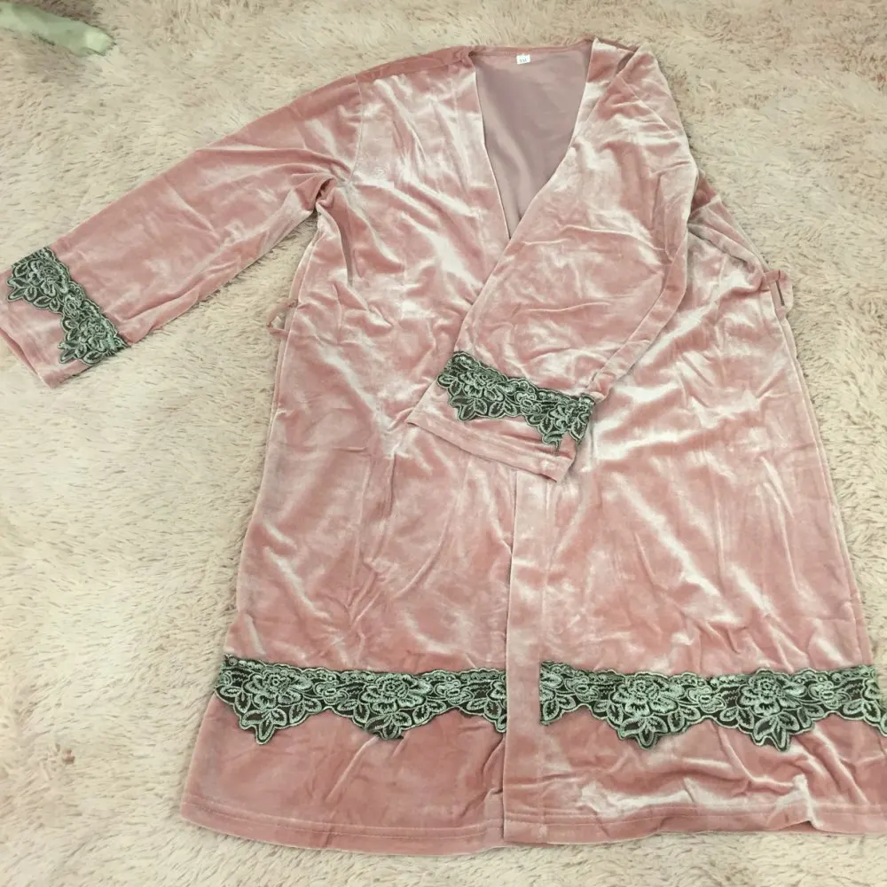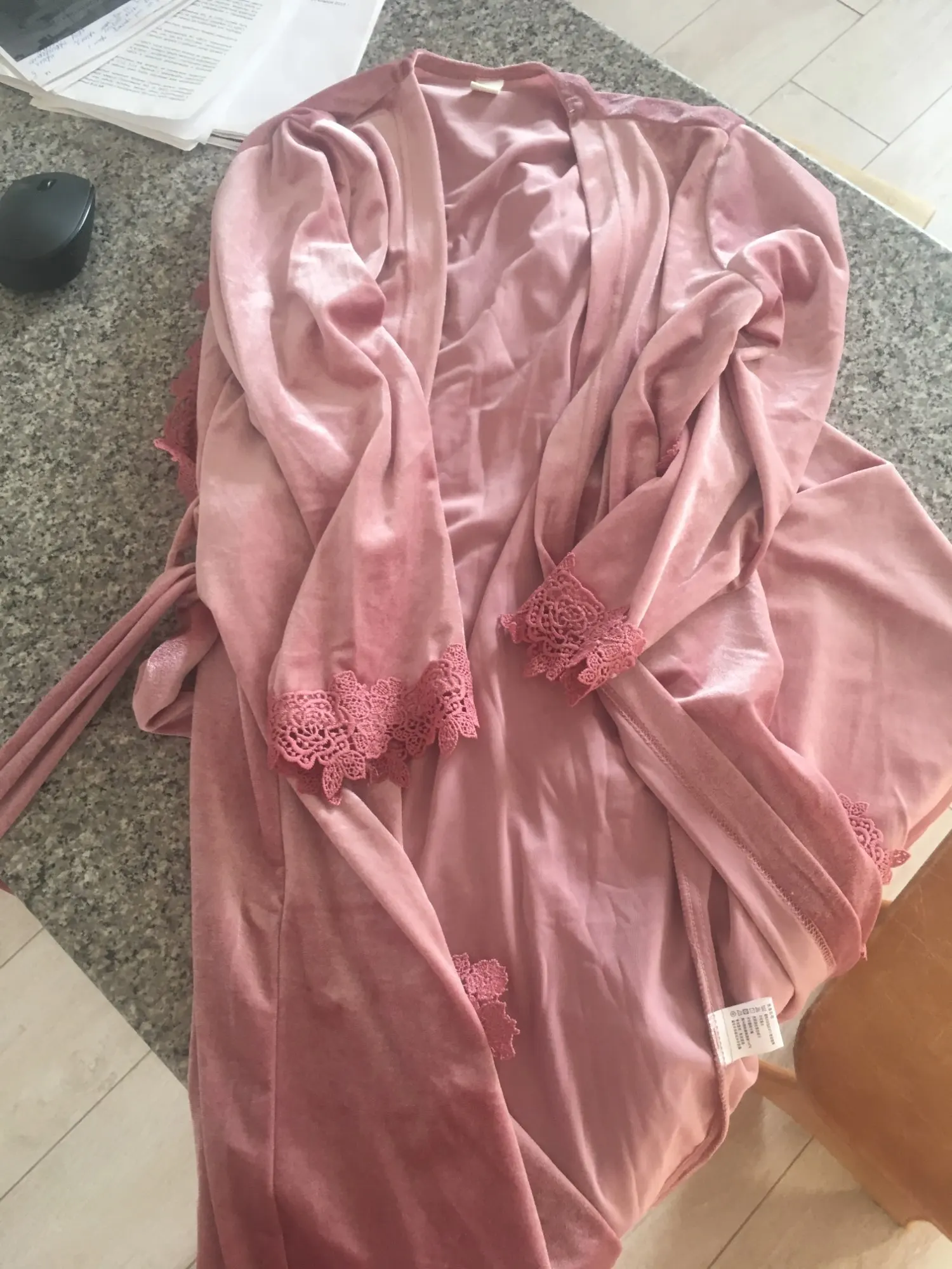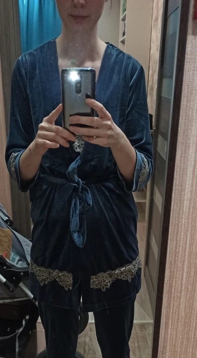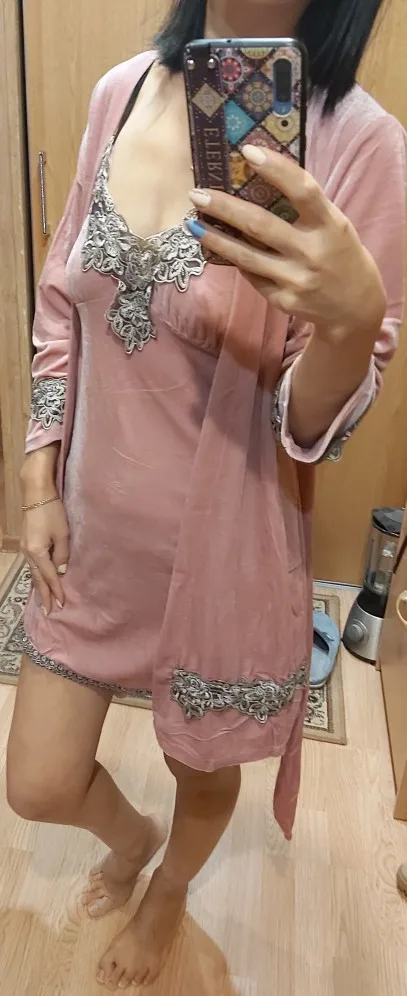 Комплект красивый, качество шикарное. Доставка из России быстрая. Единственное, что на рост 178, короткий по длине халат, но это не критично.
