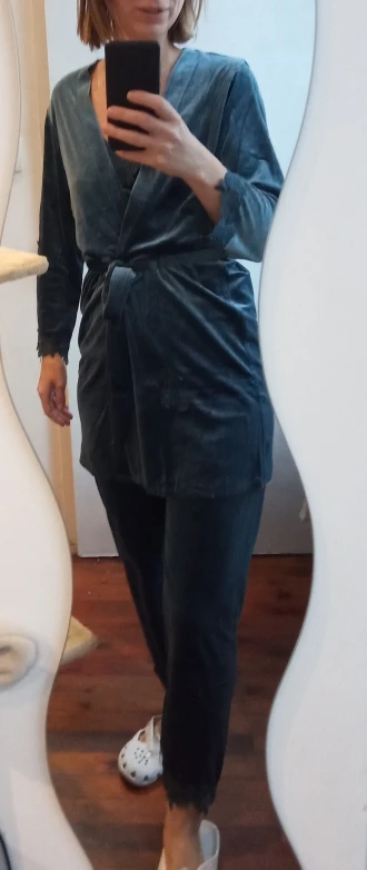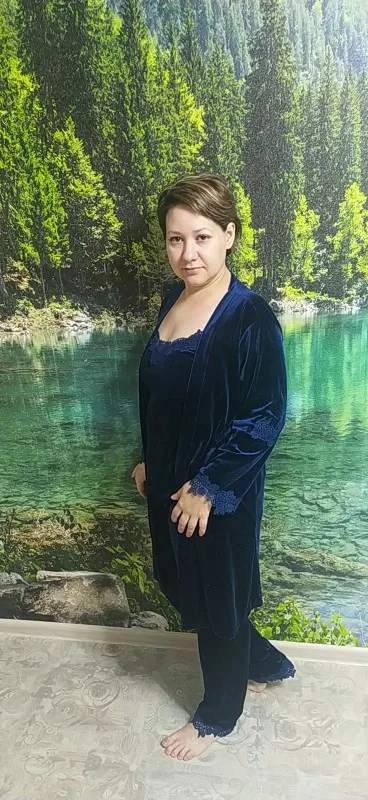 Очень красивый и приятный домашний костюм!Смотрится благородно и совсем не дёшево. на 46 и рост 175 подошёл xl свободно. Доставлен курьером до квартиры в Москву за 2 недели! нужно иметь ввиду,что эта ткань магнитит на себя шерсть животных, видно каждую пылинку.
