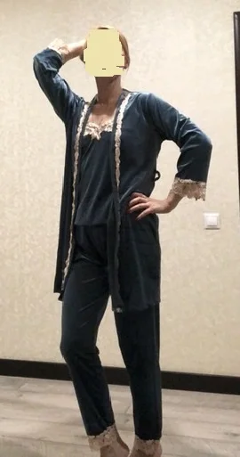 Доставили очень быстро. Благодаря, что почта загружена, доставил курьер до двери бесплатно! Качество супер! Всё было аккуратно сложено и запаковано в пакет с зип замком. На свой 42 размер заказывала М. Халат: рукав три четверти, не запахивается, но сходится, с поясом хорошо выглядит. Пижама: штаны на рост 164 как раз по длине, маечка хорошая. Ночнушка: есть дополнительные подкладки в лиф, мне не пригодились. Сидит всё хорошо, коже приятно. Продавца рекомендую!