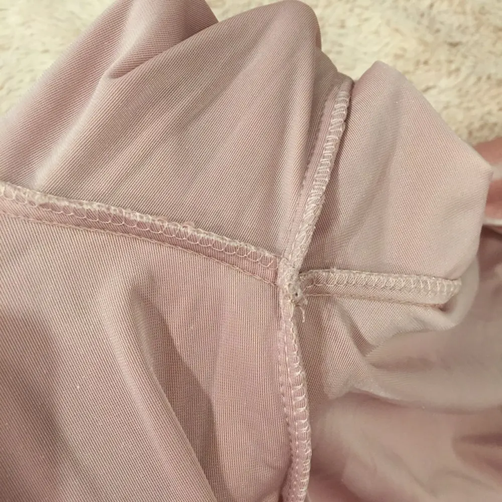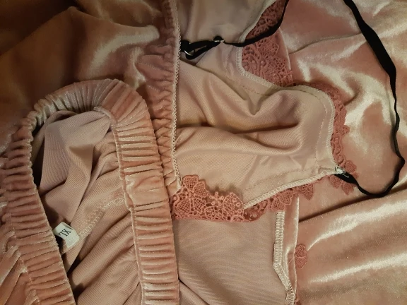 Костюм в целом неплохой, ткань синтетика, но приятная, цвет как на фото, но есть недостатки: 1) ужасные чёрные лямки к розовой майке и ночной рубашке. 2) дурацкие нашивки из кружева в неуместных местах, ещё и пристроченные на века. Выглядит оч неуместно. 3) зад и перед у штанов одинаковый, поэтому спереди образуется мотня.