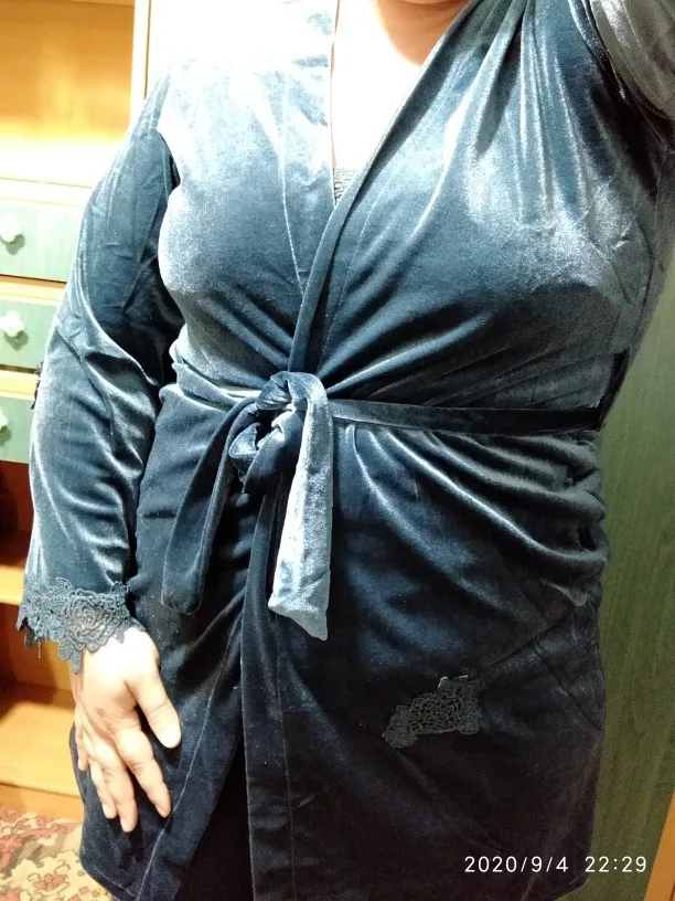 Товар пришёл за 9 дней. Все в целости, цвет кружева и ткани соответствуют фото. Комплект был упакован в пакет с зип-замком. Ткань мягкая, плотная, но электризуется. На мой объём бёдер 107 взяла xl чтобы штаны были не в облипку- отлично сели. У халата есть пояс, но нет внутри завязочек. В комплекте есть тоненькие поролоновые чашечки для сорочки. Покупкой довольна!
