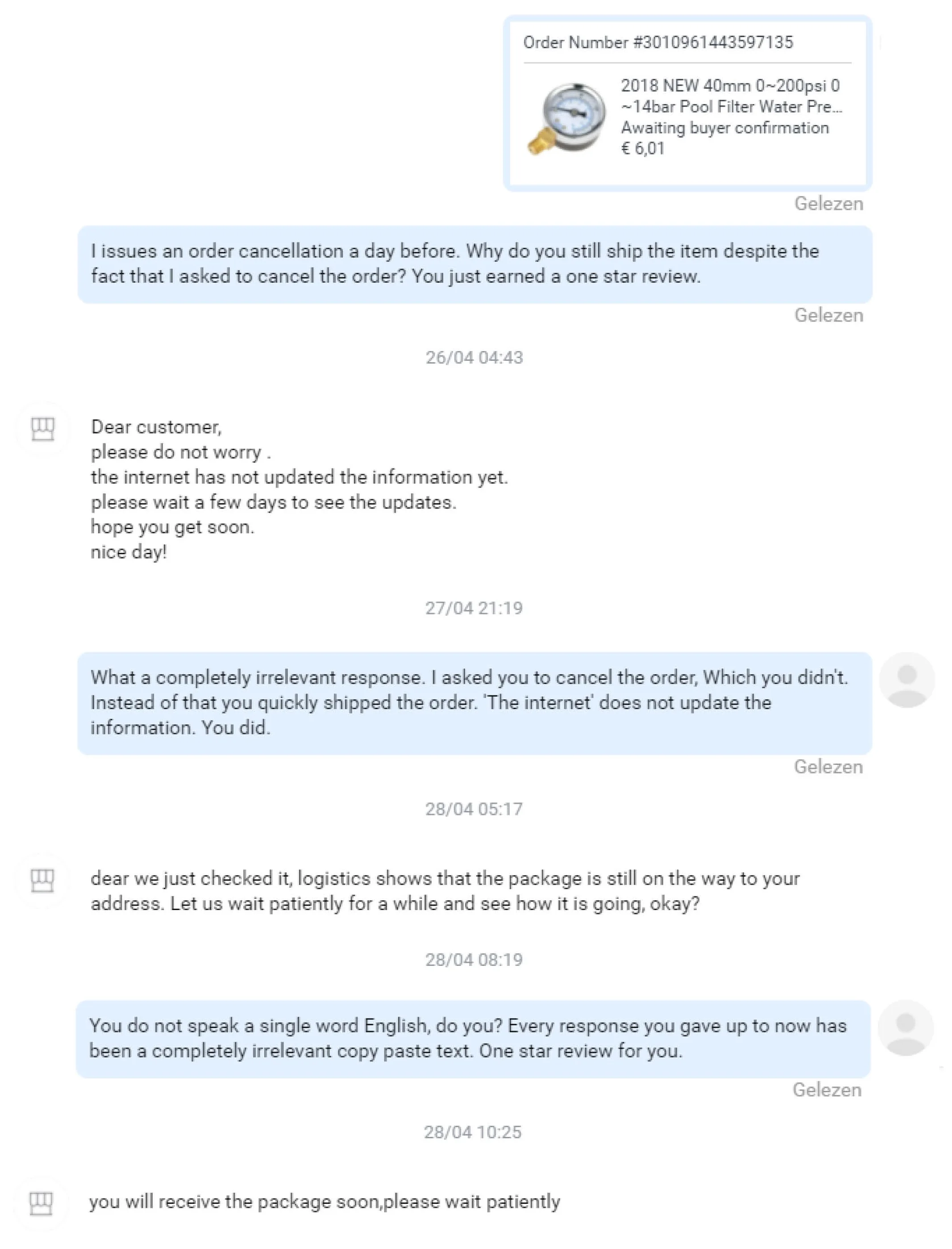 Избегайте продавца. Этот продавец не сможет понять английский язык и просто скопирует несущественные случайные сообщения в ответ. См. Прилагаемый обмен сообщениями. Продавец сделал мне трюк, который я не ценю. Из-за ошибки подсчета я заказал один товар слишком много. Согласно политике Aliexpress, вы можете отменить заказ до отправки, что я сделал вовремя. Продавец не отменяет заказ, а вместо этого отправляет товар, что делает его невозможно отменить. Много для обслуживания и целостности.