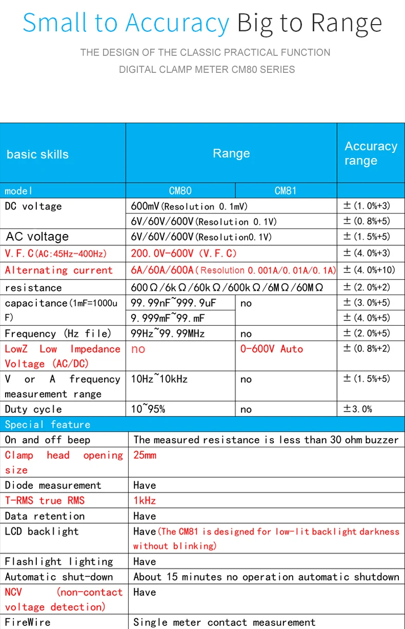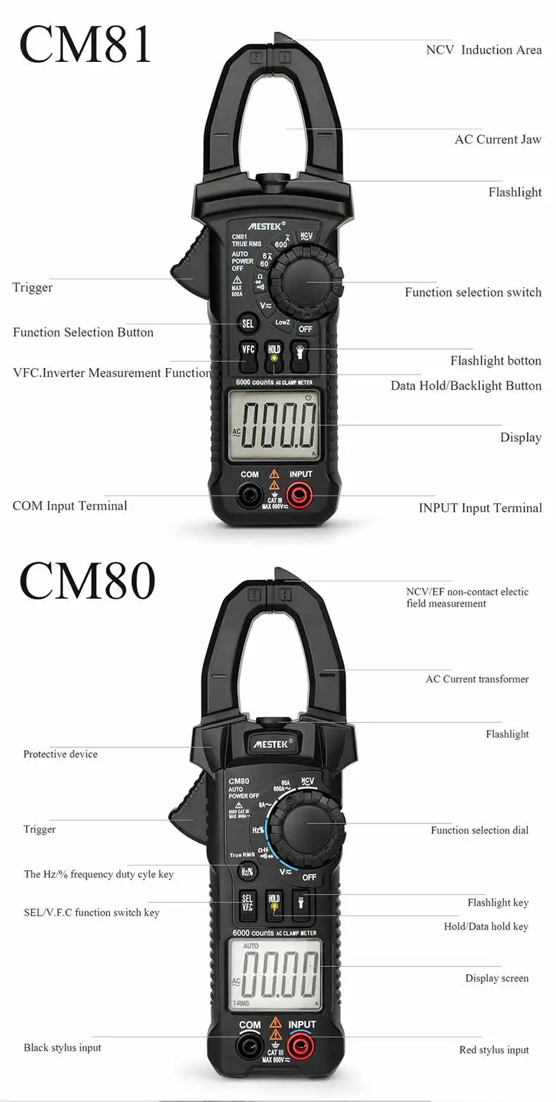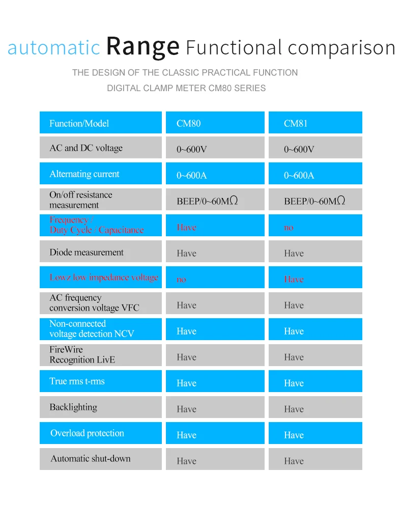 1.CM80 может измерять емкость, рабочий цикл и частоту, CM81 не может2.CM81 может измерять низкое сопротивление низкого напряжения (AC/DC 0 ~ 600 в авто),CM80 не может3. Другой такой же