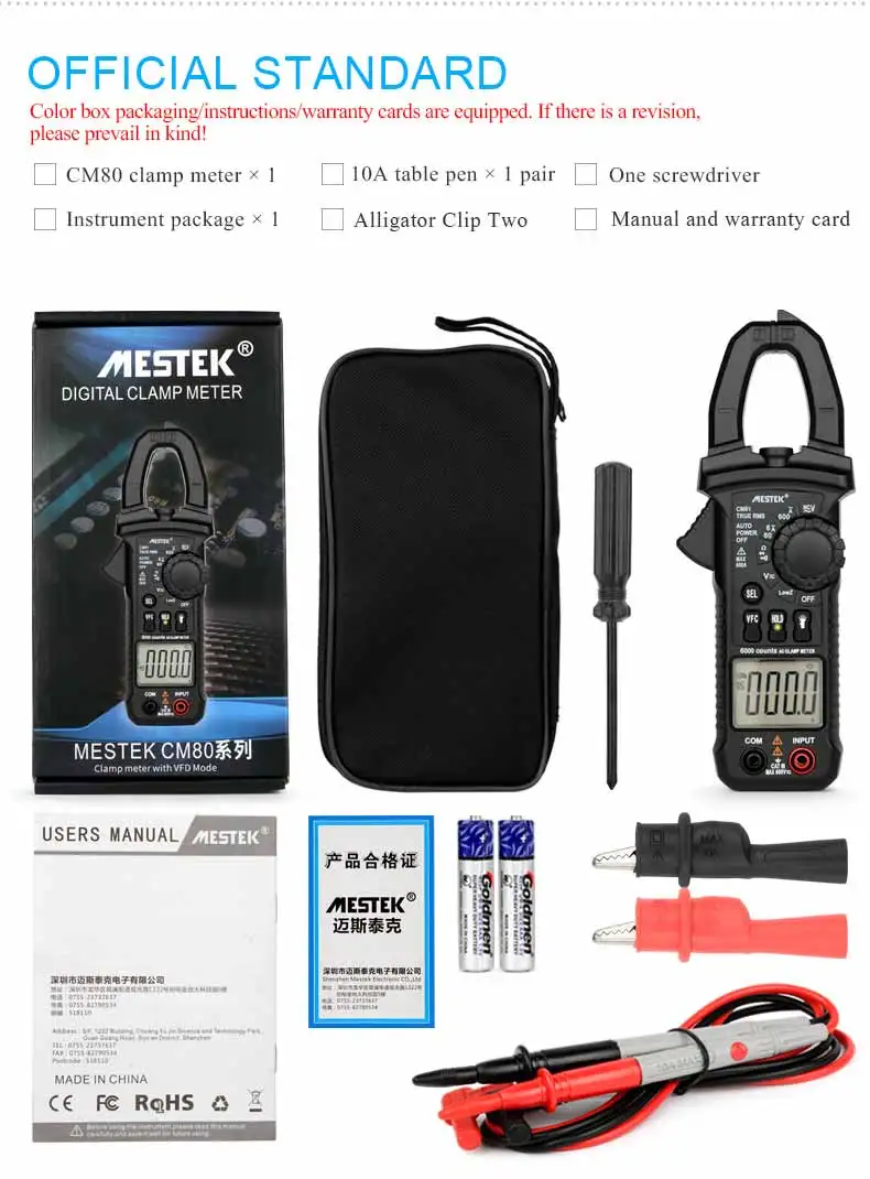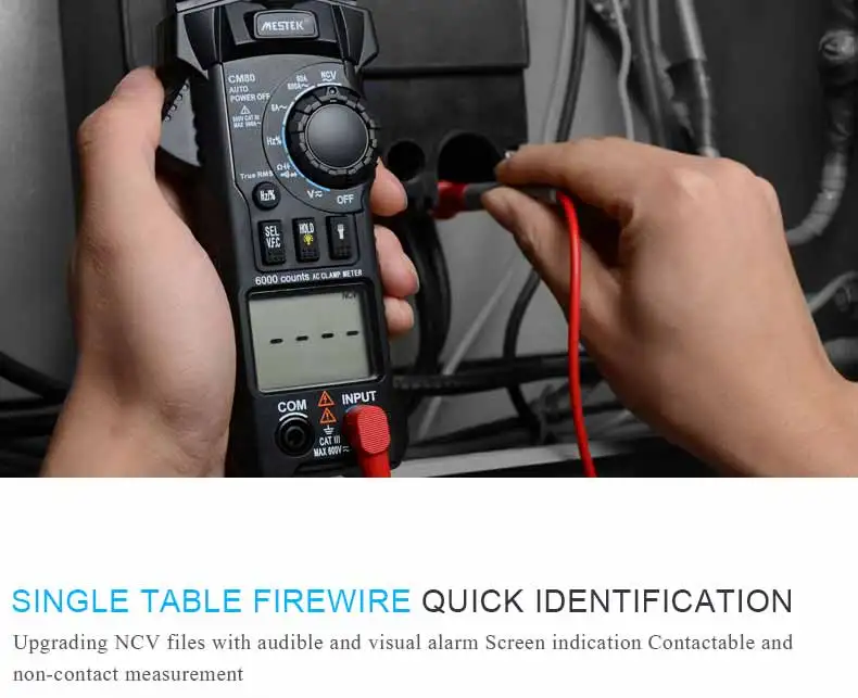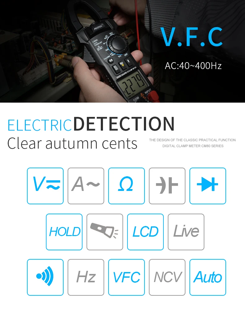 Напряжение переменного/постоянного тока, переменный ток, сопротивление, емкость (только для CM80), диод, хранение данных, функция фонарика, экран высокой четкости, обнаружение огня, испытание вкл/выкл, частота (только для CM80), напряжение преобразования частоты, Бесконтактное тестирование, Автоматический диапазон.
