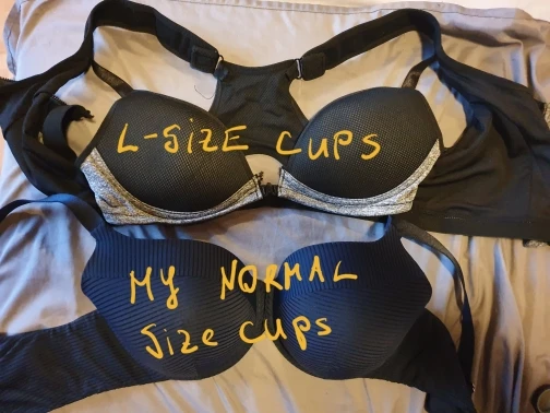 У меня есть половина моих ниппелей, висящих в бюстгальтере iner... Потому что чашки бюстгальтера слишком маленькие... Но внешний бюстгальтер и другие части бюстгальтера идеально подходят мне. Мой размер груди 80D, и я купил размер L.