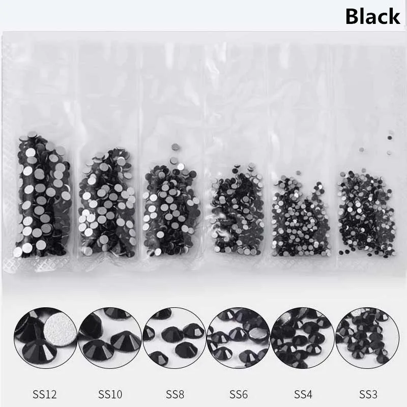 1 упаковка, черные Стразы для ногтей, плоские стеклянные, разные размеры, SS3-SS12, украшения для ногтей, блестящие камни, аксессуары для маникюра