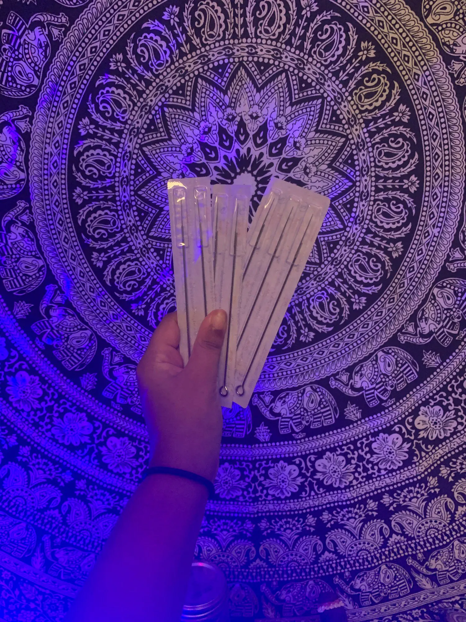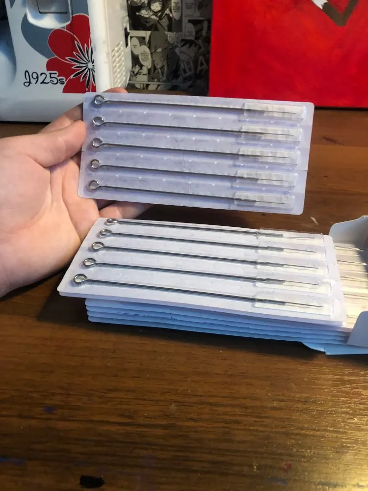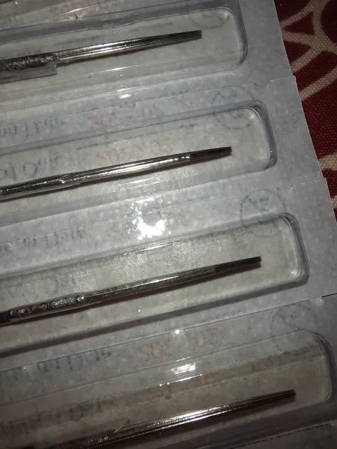 Иголки очень качественные и пришли за 20 дней! Были упаковыны просто офигенно, толстый слой пупырчатой плёнки и замотаны вот в такую коробочку. Сами иглы лежат в коробке, каждая иголка имеет свою собственную упаковку. Я дурочка и взяла 3rl, хотя я только начала заниматься хэндпоуком и лучше бы взяла 5rl или 7rl, они были бы толще. Такие у нас в городе стоят 20 рублей за одну штуку, соответственно 1000 рублей за 50 штук. А тут 50 штук за 350! Кстати, для тех кто бомж, советую вместо искусственной кожи, которая очень дорогая, покупать линолеум! Он не плохо заменяет искусственную кожу! А так иглы замечательные, продавца рекомендую!