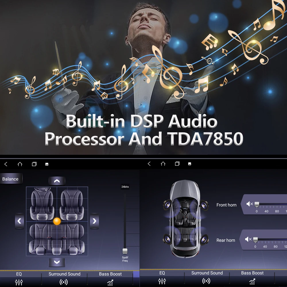 2. Встроенный DSP аудио процессор для Hi-Fi звука, независимая Регулировка передних и задних динамиков, настройка 48EQ дает вам фантастическую музыку!Какова функция встроенного DSP аудиопроцессора? Это цифровой сигнальный процессор, который позволяет вам самостоятельно управлять множеством различных сторон каждого динамика в вашей пользовательской автомобильной аудиосистеме. Вы можете выполнять различные задачи настройки с помощью DSP, такие как управление выравниванием времени для создания отличного центрального изображения, вы можете настроить Кроссоверы для отправки только определенных частот в твитеры, динамики среднего диапазона, средние басовые динамики и сабвуферы, и вы можете управлять эквалайзером, чтобы настроить каждый динамик на целевой уровень отклика.